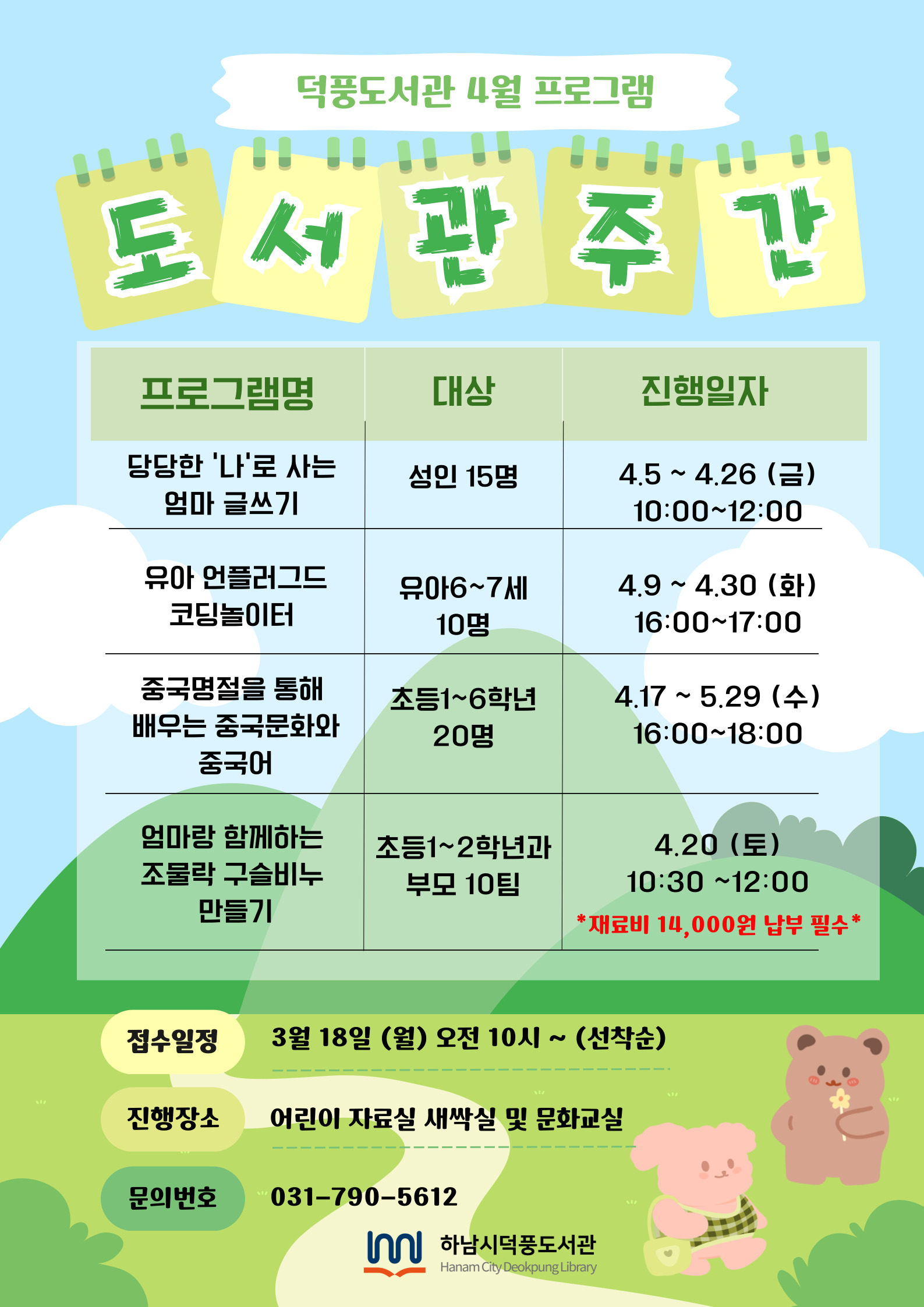 | 내용 | --[필 독]-------------------------------------------- ★ 강의 수강은 무료 입니다. ★ ★ 신청시 비고란에 아이이름, 나이 꼭 적어주세요! ★ 보호자 신청 시, 자녀의 이름, 나이를 꼭 적어주세요! ☆ 강의계획서 붙임 참고 -------------------------------------------------------