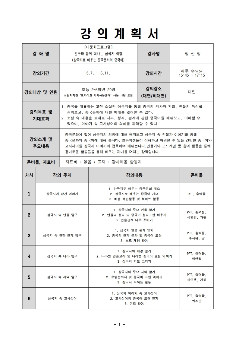 | 강좌명 | [초등 2~6] 친구와 함께 떠나는 삼국지 여행 (삼국지로 배우는 중국문화와 중국어) |