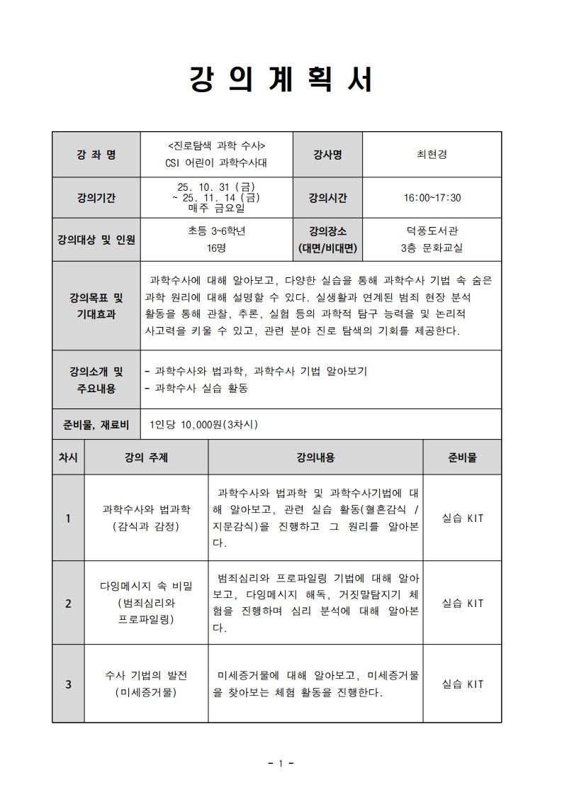 내용 | ※재료비: 1인 1만원 (과학수사 실습 KIT)![]() ![]() |
