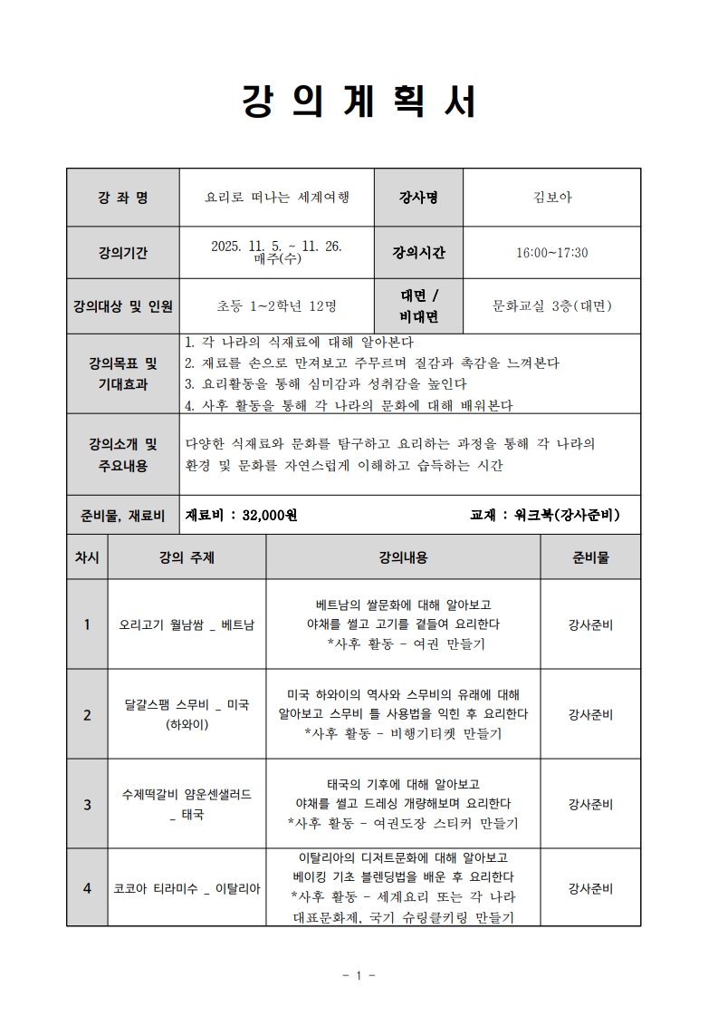 강좌명 | [초1~2] 요리로 떠나는 세계여행 |
