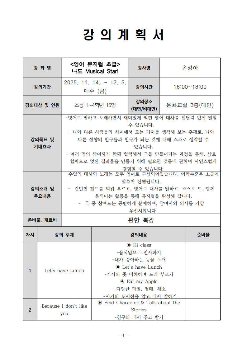 강좌명 | [초1~4] <영어 뮤지컬 초급> 나도 뮤지컬 스타! |