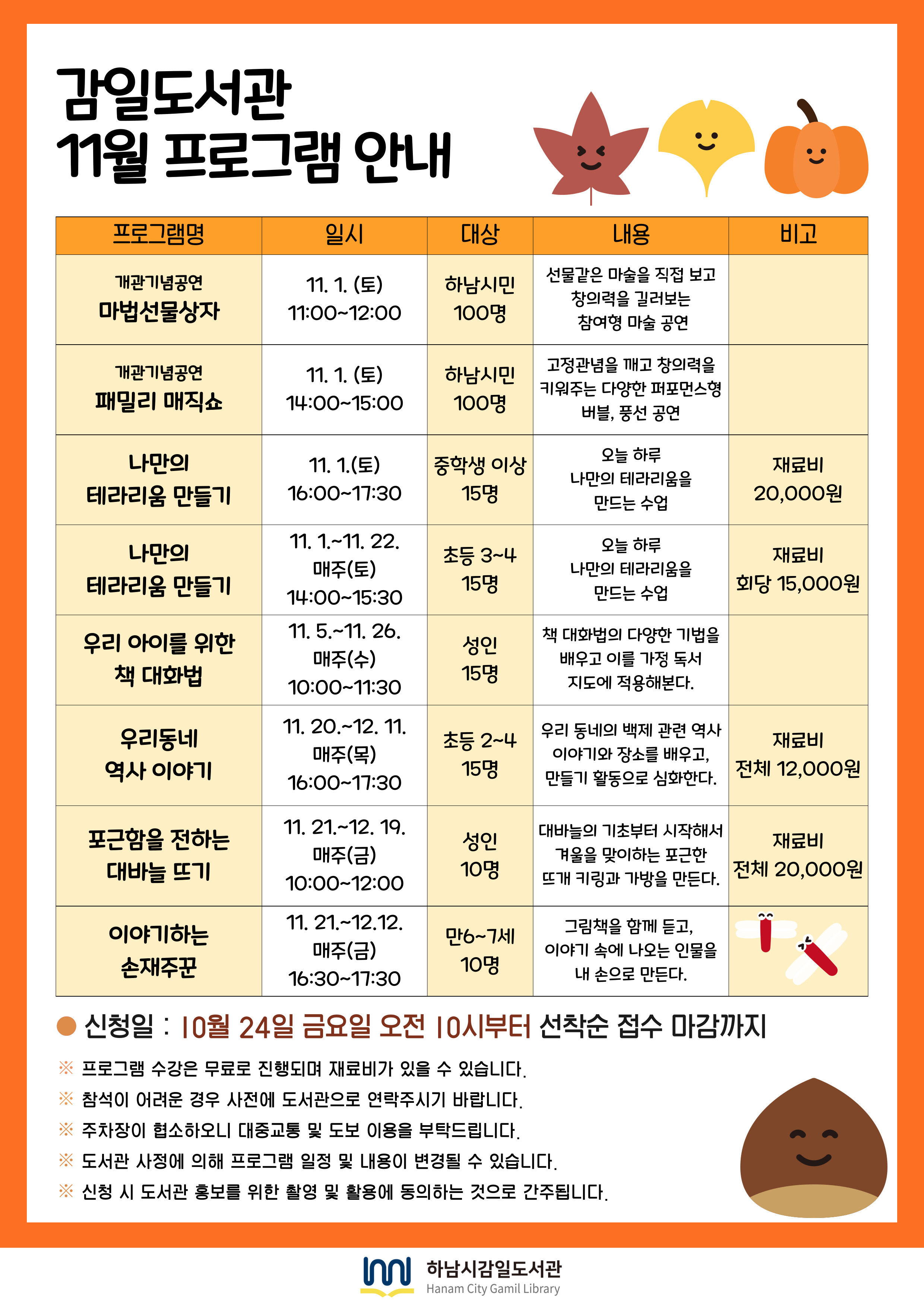 감일도서관 11월 프로그램 안내에 대한 상세 - 제목, 내용, 파일순으로 내용을 제공하고 있습니다.