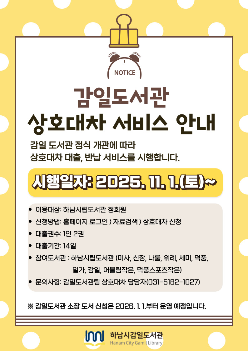하남시립도서관 상호대차 책두레 대출, 반납 서비스를 시행합니다. - 시행일자: 2025. 11. 1.(토)~ - 이용대상: 하남시립도서관 정회원 - 신청방법: 홈페이지 로그인 > 자료검색 > 상호대차 신청 > 도서대출 - 신청권수: 1인 2권 - 대출기간: 14일 - 참여도서관 : 하남시립도서관 (미사, 신장, 나룰, 위례, 세미, 덕풍, 일가, 감일, 어울림작은, 덕풍스포츠작은) - 문의사항: 감일도서관팀 상호대차 담당자(031-5182-1027) ※ 감일도서관 소장 도서 신청은 2026. 1. 1.부터 운영 예정입니다. |
