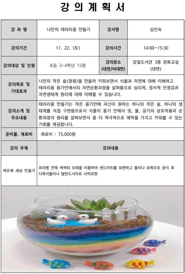 | 강좌명 | [초등3~4] 나만의 테라리움 만들기 ★재료비 15,000원★ |