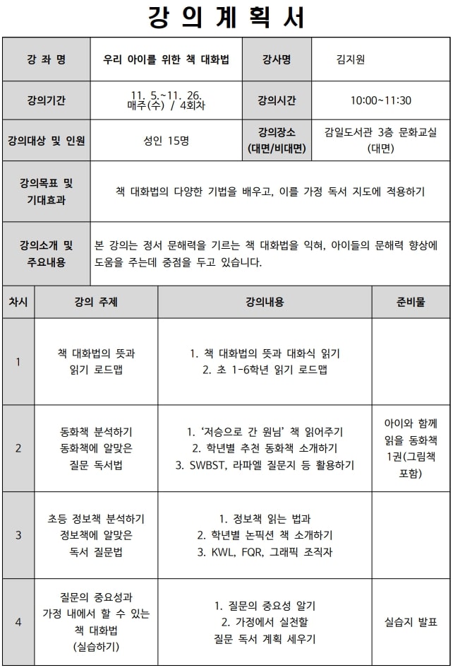 | 강좌명 | [일반] 우리 아이를 위한 책 대화법 |