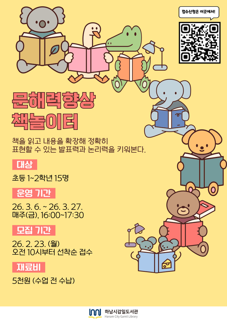| 내용 | ★수강신청 시, 신청자와 수강자가 다를 경우 비고란에 인적사항을 적어주세요.★ - 이름, 학년, 성별 (ex. 김하남, 3학년, 여성) ※ 1계정 당 1명만 신청 가능합니다. - 두 명의 자녀를 신청 할 경우 두 개의 아이디가 필요합니다. ※ 일정 및 내용은 도서관 사정에 따라 변경될 수 있습니다. ※ 해당 프로그램은 재료비가 5천원 발생합니다. 재료비는 명단 확정 후 문자로 계좌번호를 안내해드립니다. ※ 프로그램 참여 시, 도서관 홍보를 위한 사진 촬영 및 활용에 동의하는 것으로 간주합니다. ▷ 대상 : 초등 1~2학년 15명 ▷ 일시 : 2026. 3. 6.~2026. 3. 27. 매주(금) 16:00~17:30 / 총4회차 ▷ 장소 : 3층 문화교실 ▷ 신청 : 2. 23.(월) 10시부터 ~ 선착순 마감 ▷ 문의 : 031-5182-1158 ▷ 강의계획서 : 붙임파일 참고