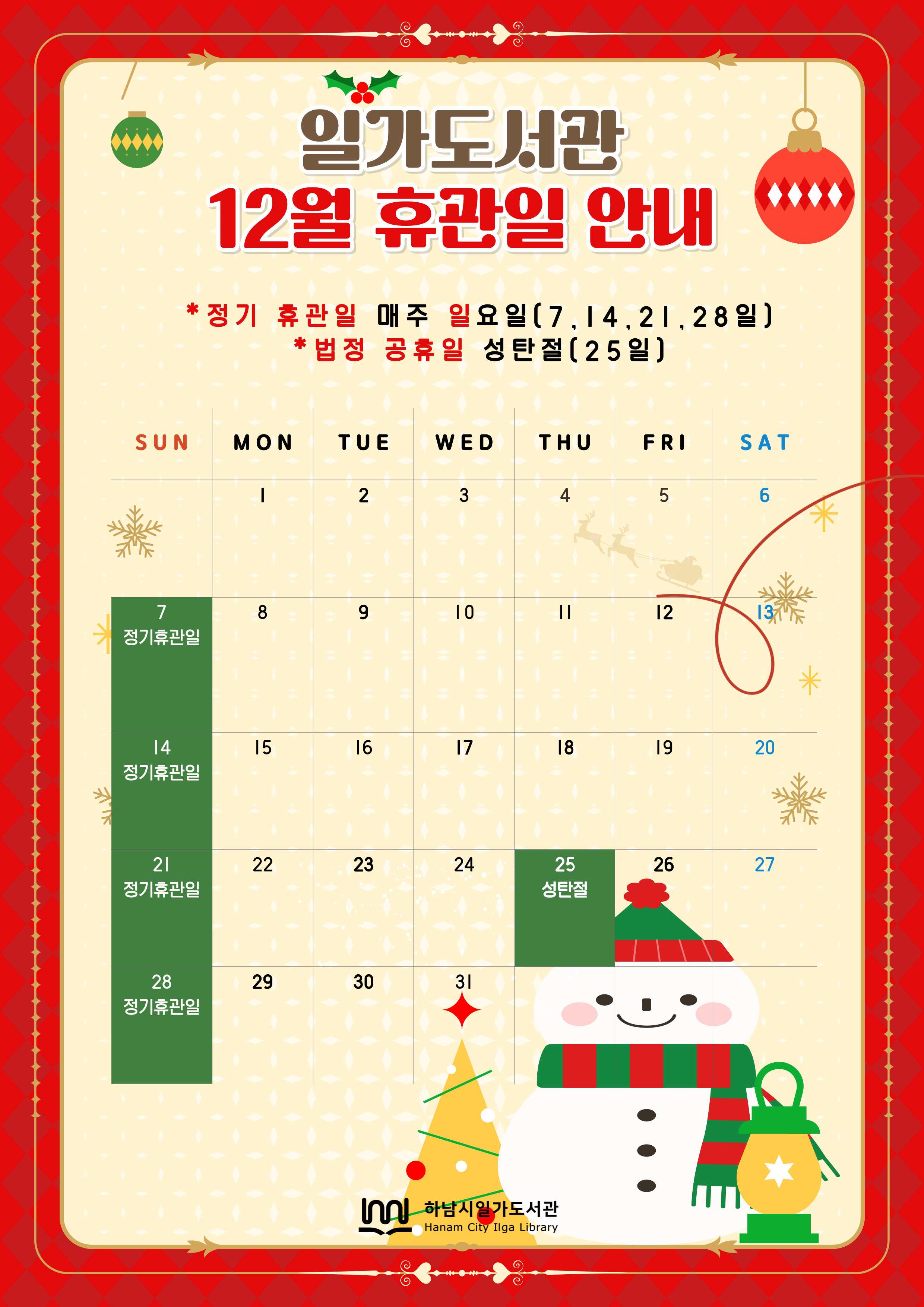 제목 2025년 12월 일가도서관 휴관일