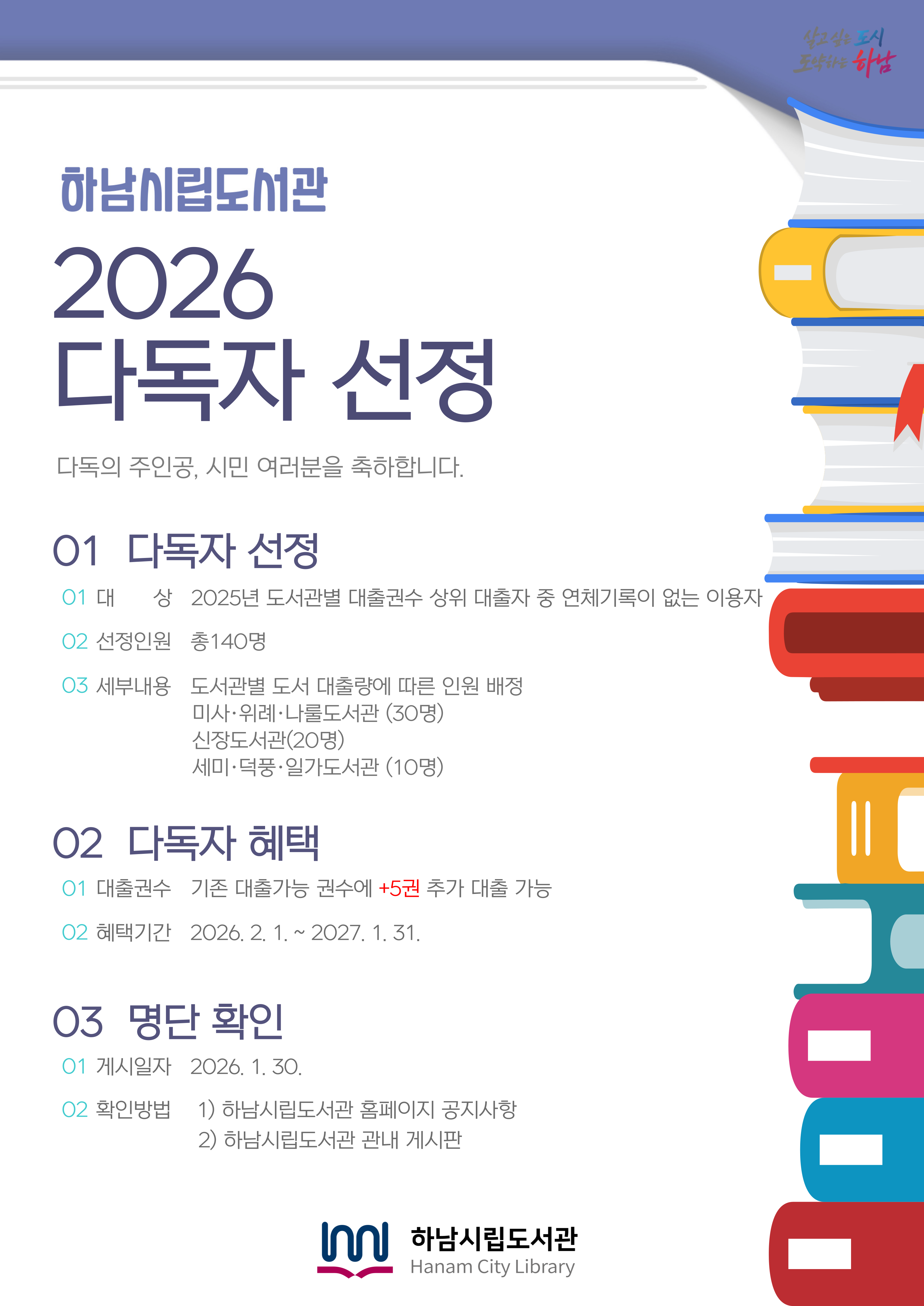 이전글 2026년 2월 일가도서관 휴관일 및 설 연휴 무인 반납함 운영 중지 안내