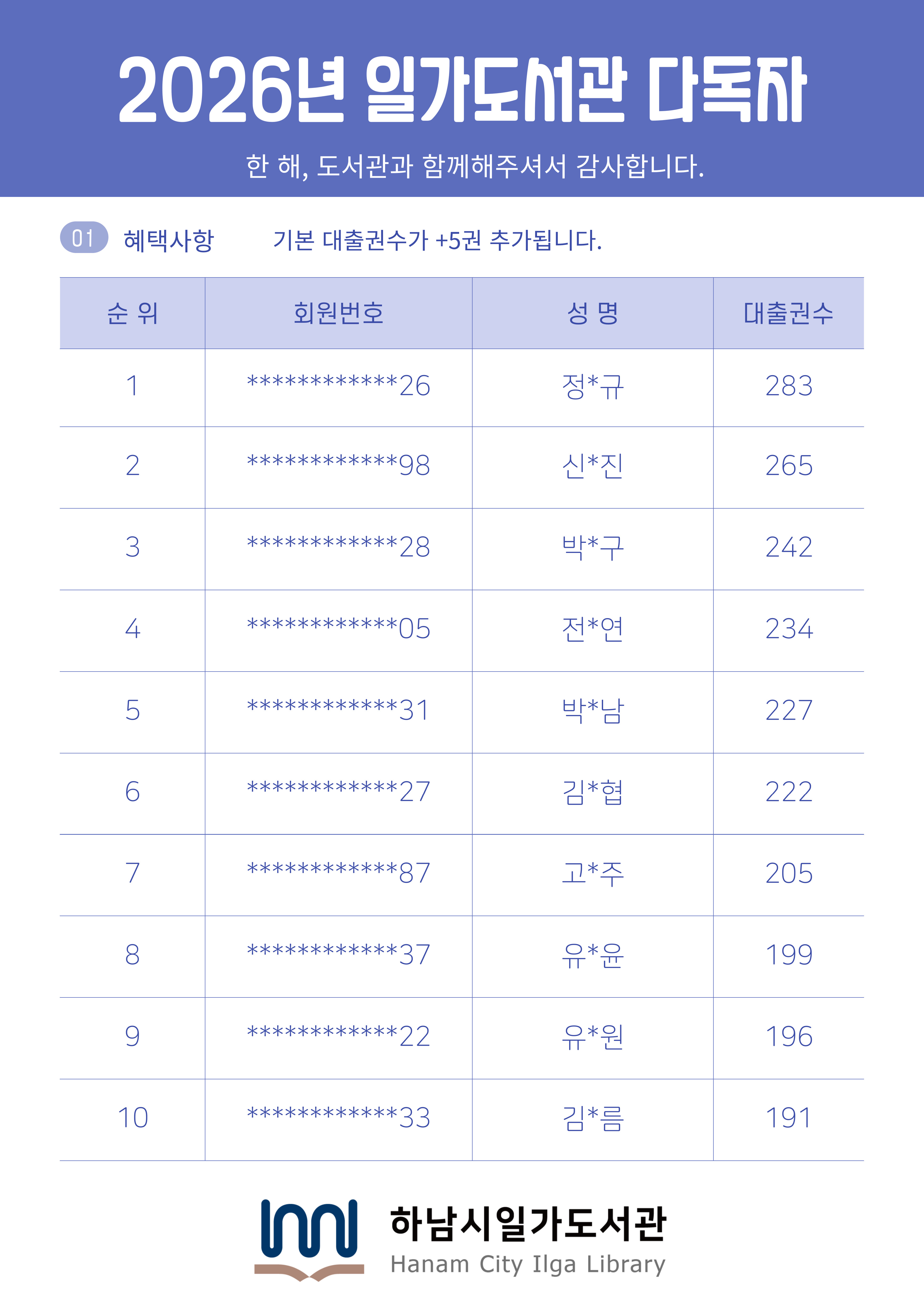2026년 일가도서관 다독자 선정에 대한 상세 - 제목, 내용, 파일순으로 내용을 제공하고 있습니다.