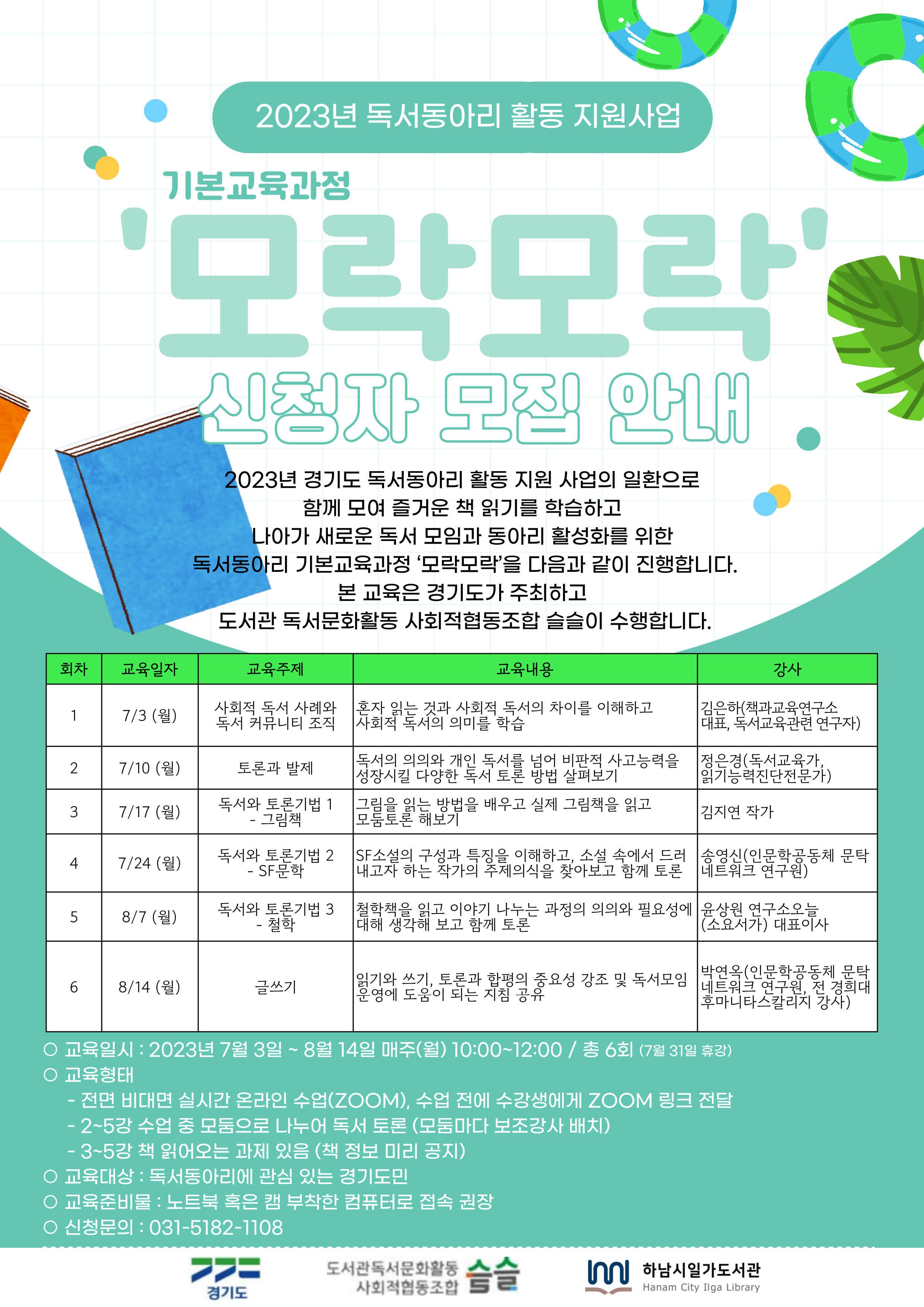 | 내용 | 일가도서관이 2023년 경기도 독서동아리 활동 지원 사업의 기본교육 과정에 선정되었습니다. 좀 더 심층적으로 책을 재밌게 읽어보고 싶으신 분, 향후 독서동아리 활동 및 운영에 관심 있으신 분들의 많은 참여 부탁드립니다.