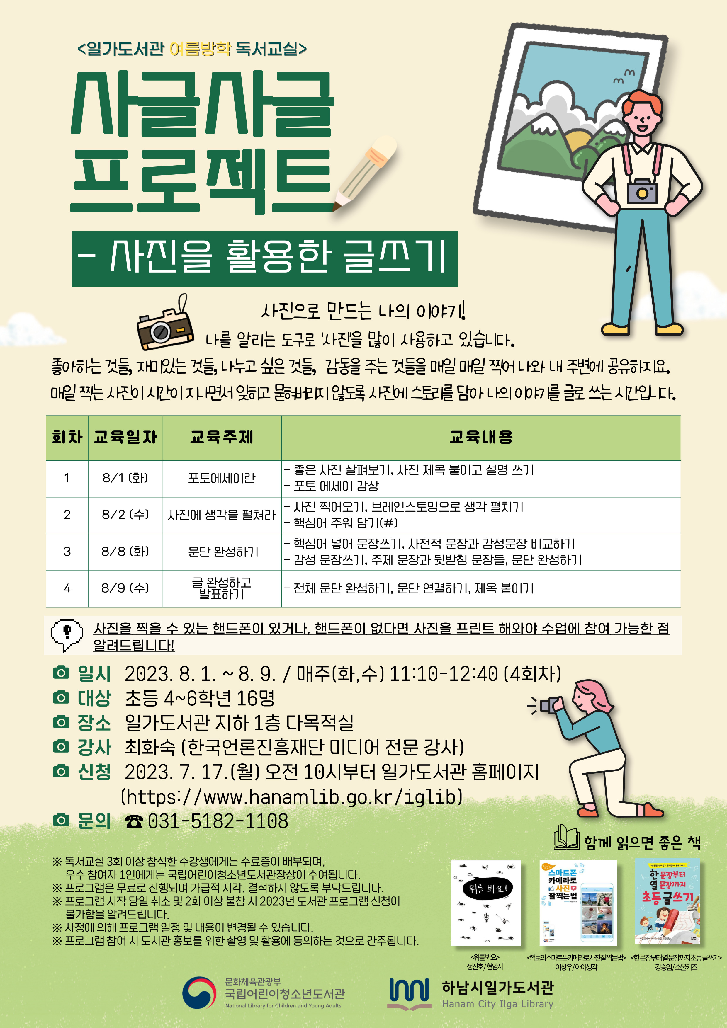 | 강좌명 | <독서교실> 사글사글 프로젝트 - 사진을 활용한 글쓰기 |