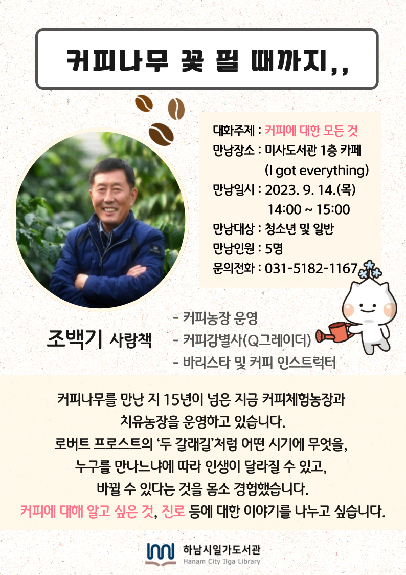 | 강좌명 | <하남 사람책 스페셜 데이> 조백기 사람책(커피농장 운영) - 커피나무 꽃 필때까지,, |