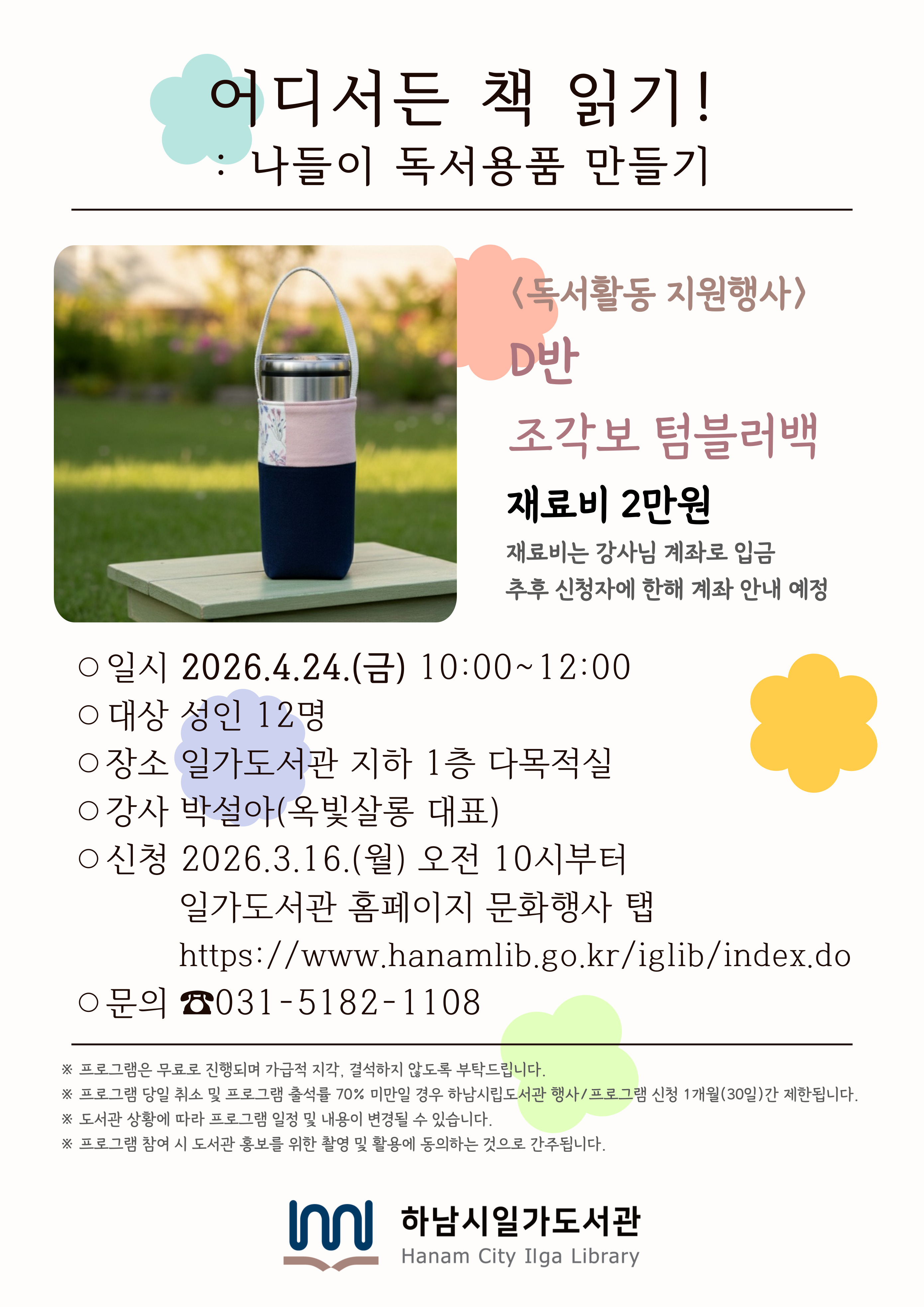 | 강좌명 | <독서활동 지원행사> 어디서든 책 읽기!: 나들이 독서용품 만들기 D반 조각보 텀블러백 |