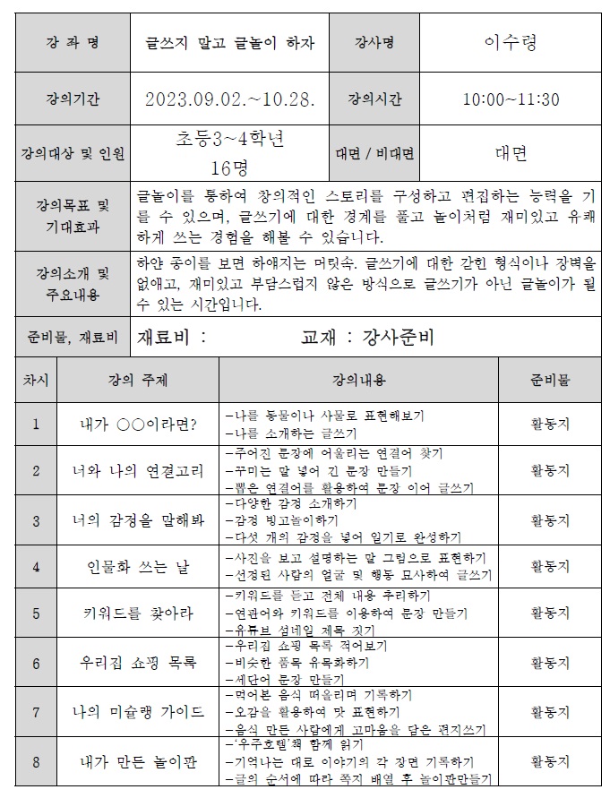 | 강좌명 | (초등3~4) 글쓰지 말고 글놀이 하자 |