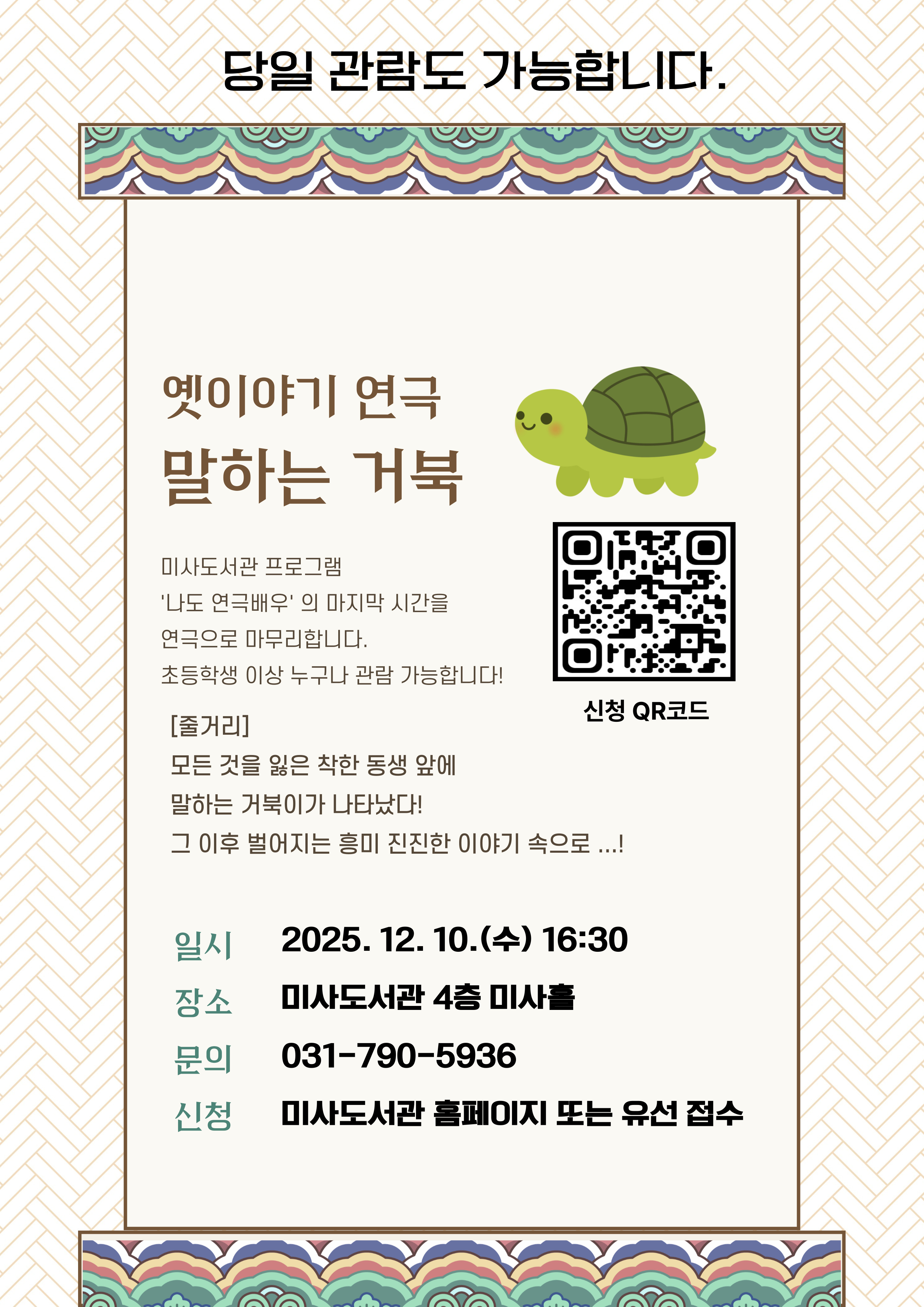 | 내용 | ○ 미사도서관 <옛이야기 연극: 말하는 거북> -일시: 2025. 12. 10.(수) 16:30~ -장소: 미사도서관 4층 미사홀 -출연진: 미사도서관 독서활동 지원행사 프로그램 '나도 연극배우' 참여자 일동 -대상: 초등학생 이상 누구나 -신청: 미사도서관 홈페이지 또는 유선 접수, 당일 현장 참여 가능