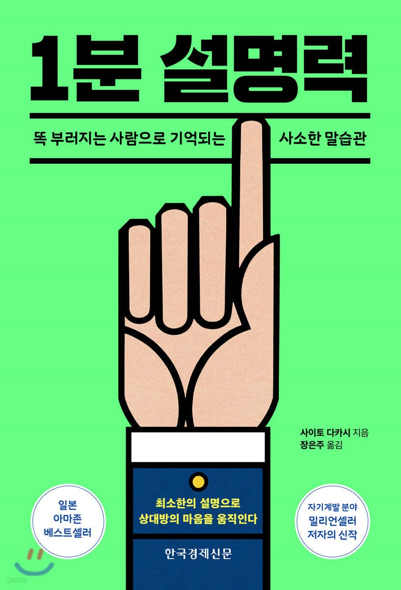 ![]() 오랜 세월 '설명의 기술'을 학생들에게 지도해온 사이토 다카시 교수가 공적인 자리부터 일상생활 속 대화까지 다양한 상황에서 단순하고 명쾌하며 센스까지 겸비한 설명력을 키울 수 있는 방법을 알려준다. '1분 안에(시간 감각)' '3가지 핵심으로(요약 능력)' '추상적인 것을 구체화한다(예시 능력)' 이 3가지의 핵심 기술을 알고 잘 활용할 수 있다면, 아무리 복잡한 내용이라도 상대방에게 논리정연하게 단 1분 안에 설명할 수 있을 뿐만 아니라 지적인 사람이라는 긍정적 이미지를 줄 수 있다. - 책 소개 중 |