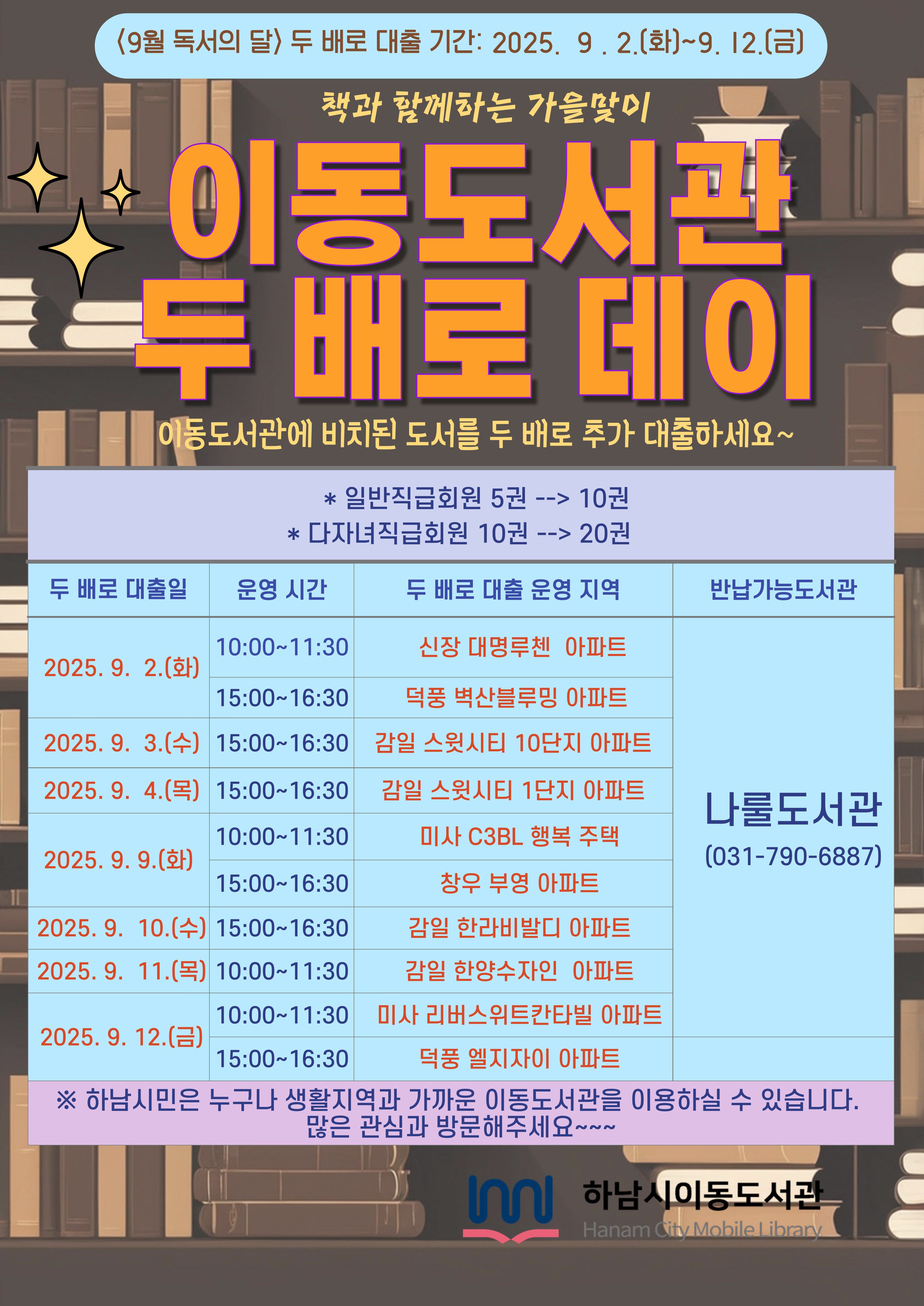 9월 <독서의 달>을 맞아 시민들의 독서활동 증진을 위해 도서를 추가로 대출하는 하남시이동도서관 1. 운영일시: 2025. 9. 2.(화)~9. 12.(금) 이동도서관 방문지 운영시간 내 2. 운영대상: 하남시립도서관 정회원 3. 운영지역: 총 10개소 ※일반직급 5권→10권, 다자녀직급 10권→20권 |