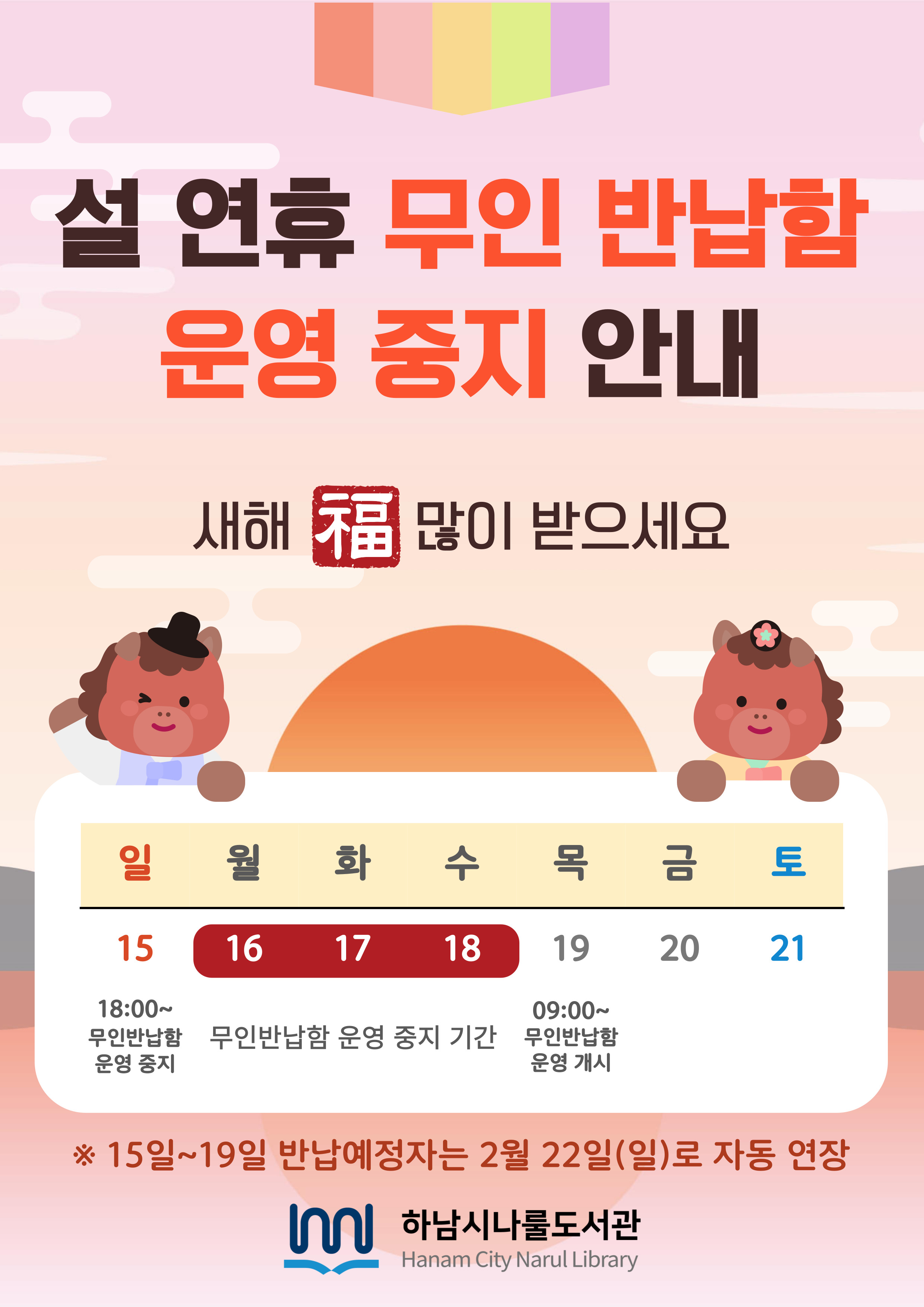 제목 2026년 2월 나룰도서관 설 연휴 무인 반납함 운영 중지 안내