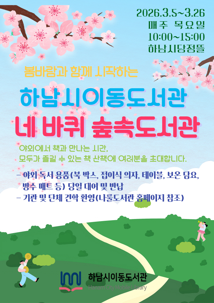 [개요] < 이동도서관 "네 바퀴 숲속도서관" 운영> - 운영일시: 2026. 03.05 ~ 매주 목요일 10:00~15:00 - 운영대상: 하남시민, 개인 및 단체 - 운영장소: 야외공원 [3월 운영지역: 당정뜰 연꽃연못 옆(신장동 244)] - 운영내용: 하남시립도서관 회원가입 및 야외독서용품(북박스, 등받이 의자, 담요, 방수 매트 등) 당일 대여 및 당일 회수 이동도서관 차량 내 비치 도서 열람 및 대출 * 기관 사정 및 기상주의보 발령 시(홈페이지 공지) 상황에 따라 일정이 변경될 수 있음 ** 월별 장소는 도서관 홈페이지내 이동도서관 운영일정표 참조 ![]() |