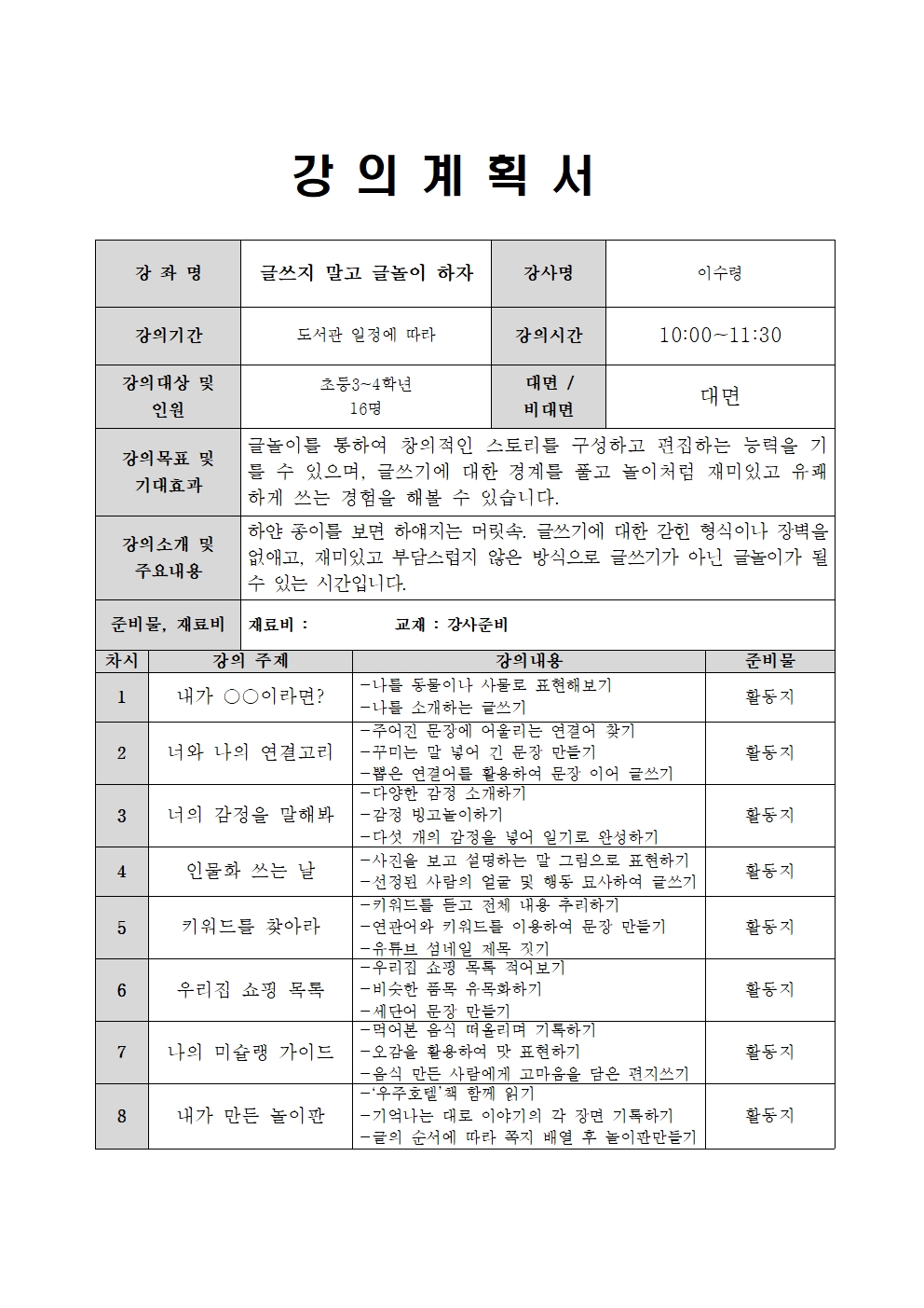 | 강좌명 | 글쓰지 말고 글놀이 하자! |