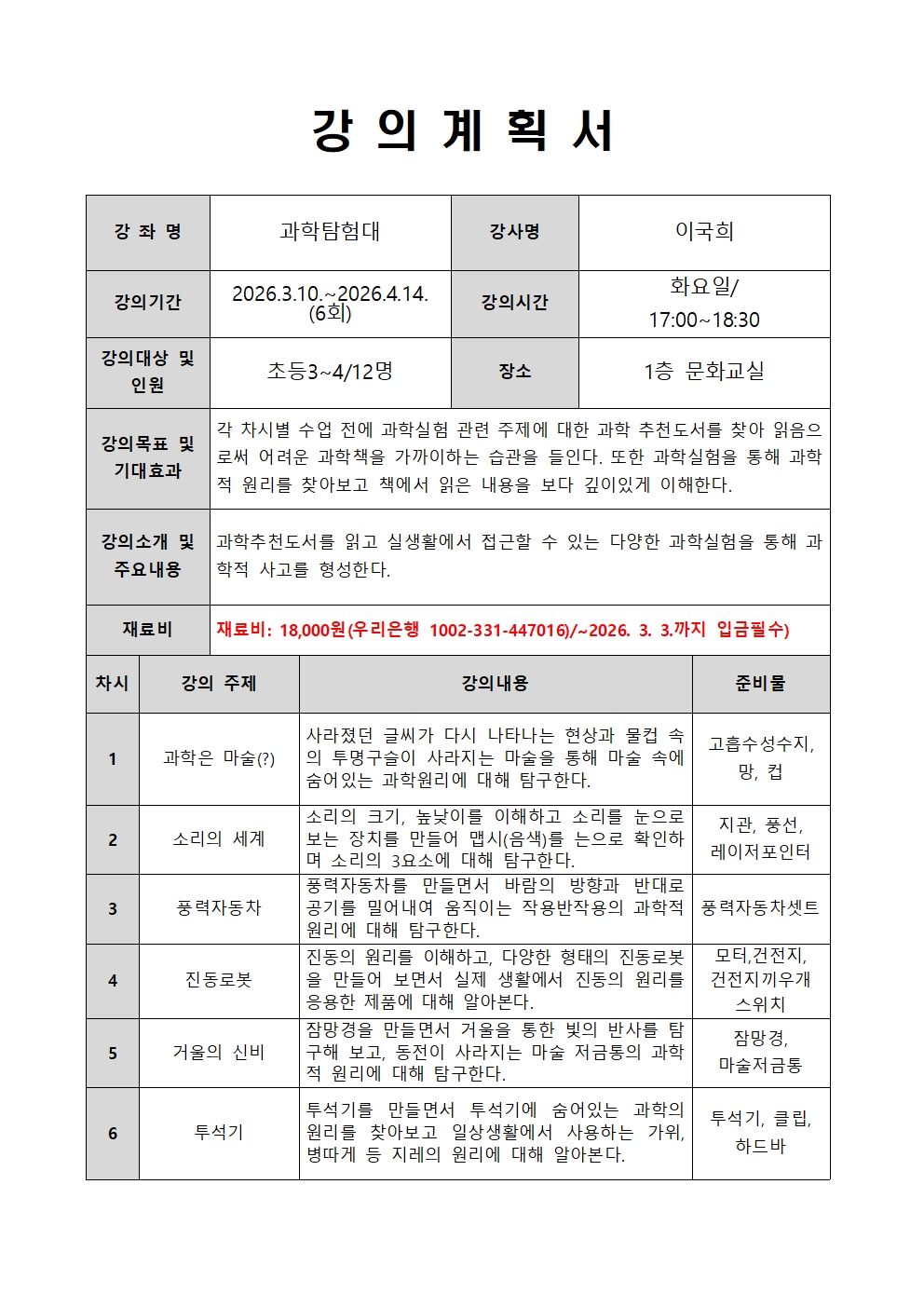 | 내용 | ※ 취소는 첫수업 전일까지 가능하며, 당일 취소 및 프로그램 출석률이 70% 미만일 경우 하남시립도서관 행사/프로그램 신청이 1개월(30일)간 제한됩니다. ※ 부모님 아이디로 신청할 경우, 비고란에 자녀 이름과 생년월일을 적어주세요. ※ 재료비: 18,000원(우리은행 1002-331-447016 / ~26.3.3.까지 입금필수) *강의내용 : 과학추천도서를 읽고 실생활에서 접근할 수 있는 다양한 과학실험을 통해 과학적 사고를 형성 *신청기간 : 2.19.(화) 오전 10시부터 마감 시까지 *신청방법 : 나룰도서관 홈페이지 선착순 접수 *유의사항 - 나룰도서관 주차장은 1시간 무료이며, 이후에 발생되는 주차비용은 자부담입니다. - 강사 또는 도서관 내부사정에 의해 일정 및 내용은 변경될 수 있습니다. - 프로그램 참여 시 도서관 홍보를 위한 촬영 및 활용에 동의하는 것으로 간주합니다. *문의: 031-5182-1047