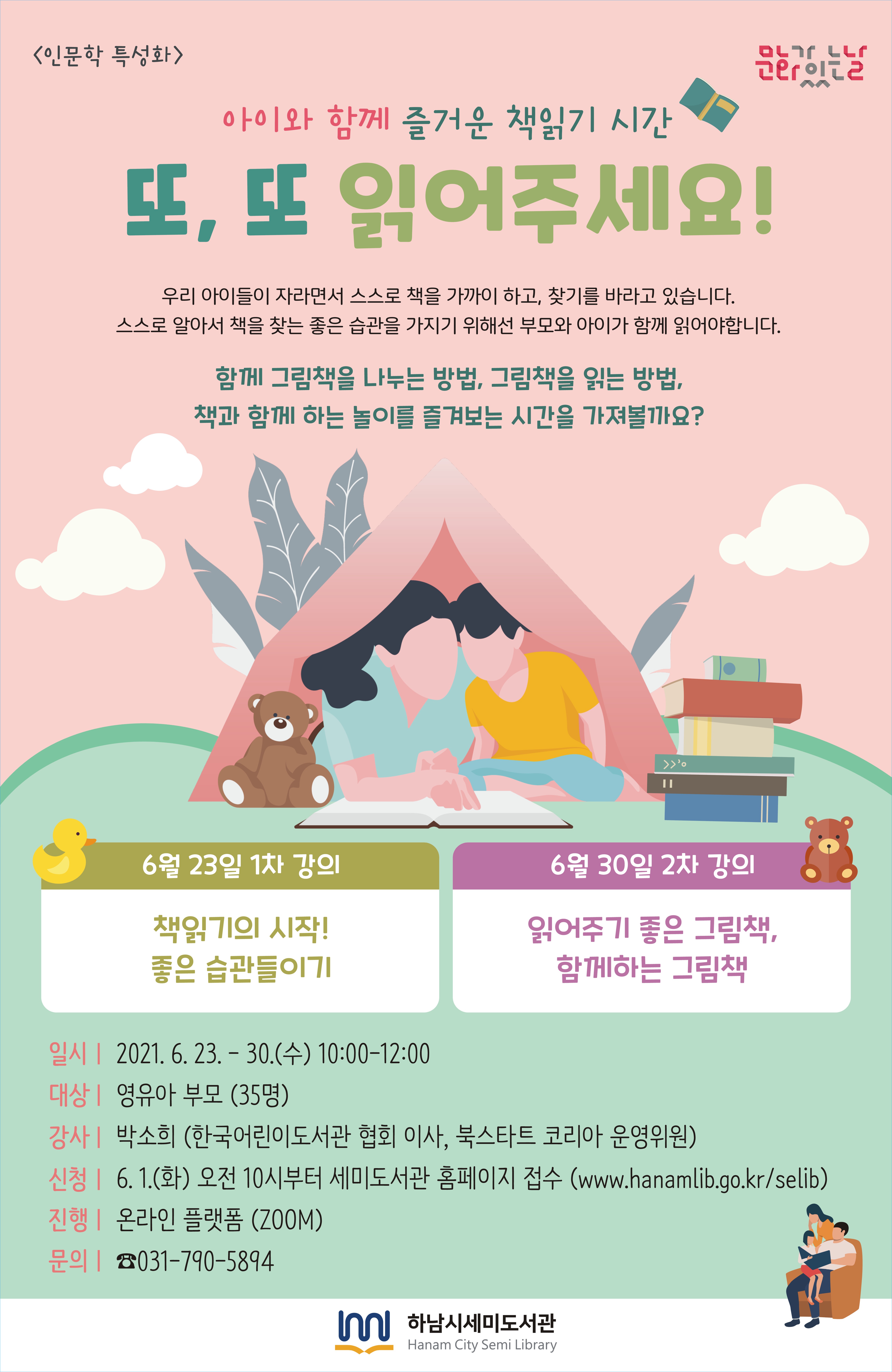 | 내용 | ![]() *일 시 : 2021. 6. 23 - 30 (수) / 10:00~12:00 / 2회 *모집기간 : 2021년 6월 1일 (화) 10시부터 세미도서관 홈페이지 접수 *모집대상 : 영유아 부모 *모집인원 : 35명 *진행방법 : 온라인플랫폼(Zoom) ★프로그램은 무료로 진행되며, 2회이상 불참시 다음 프로그램 신청이 제한됨을 알려드립니다. ★프로그램 참여시 도서관 홍보를 위한 촬영 및 활용에 동의하는 것으로 간주합니다. |