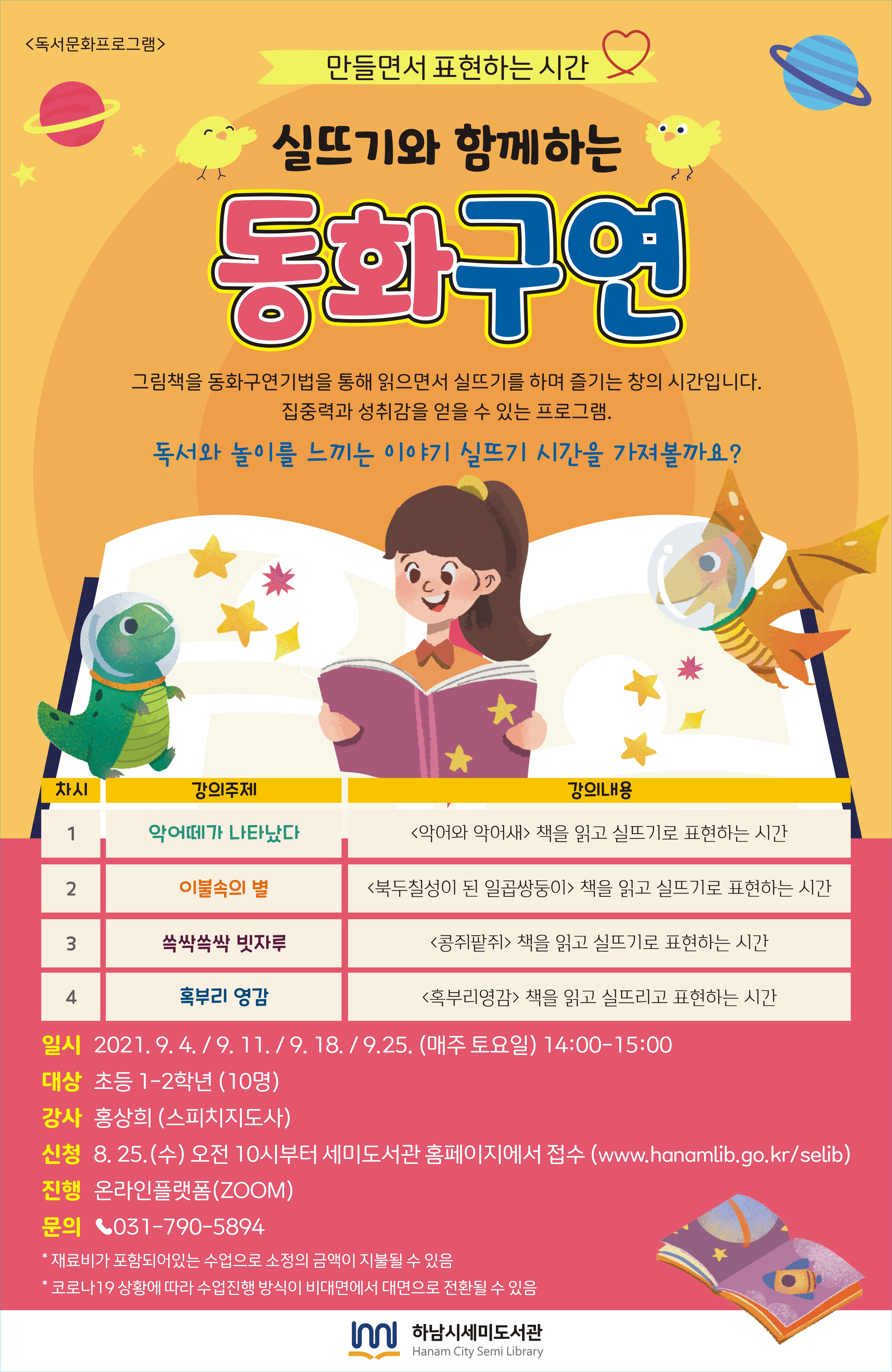 | 내용 | ![]() *일 시 : 2021. 9 . 4 ~ 9. 25 / 매주(토) 14:00~15:00 *모집기간 : 2021년 8월 25일 (수) 10시부터 세미도서관 홈페이지 접수 *모집대상 : 초등 1 -2 학년 / 10명 *진행방법 : 온라인플랫폼 (ZOOM) ★ 프로그램 참여시 도서관 홍보를 위한 촬영 및 활용에 동의하는 것으로 간주합니다. ★ 코로나19 상황으로 인해 프로그램 일정이 변경될 수 있음을 미리 알려드립니다. |