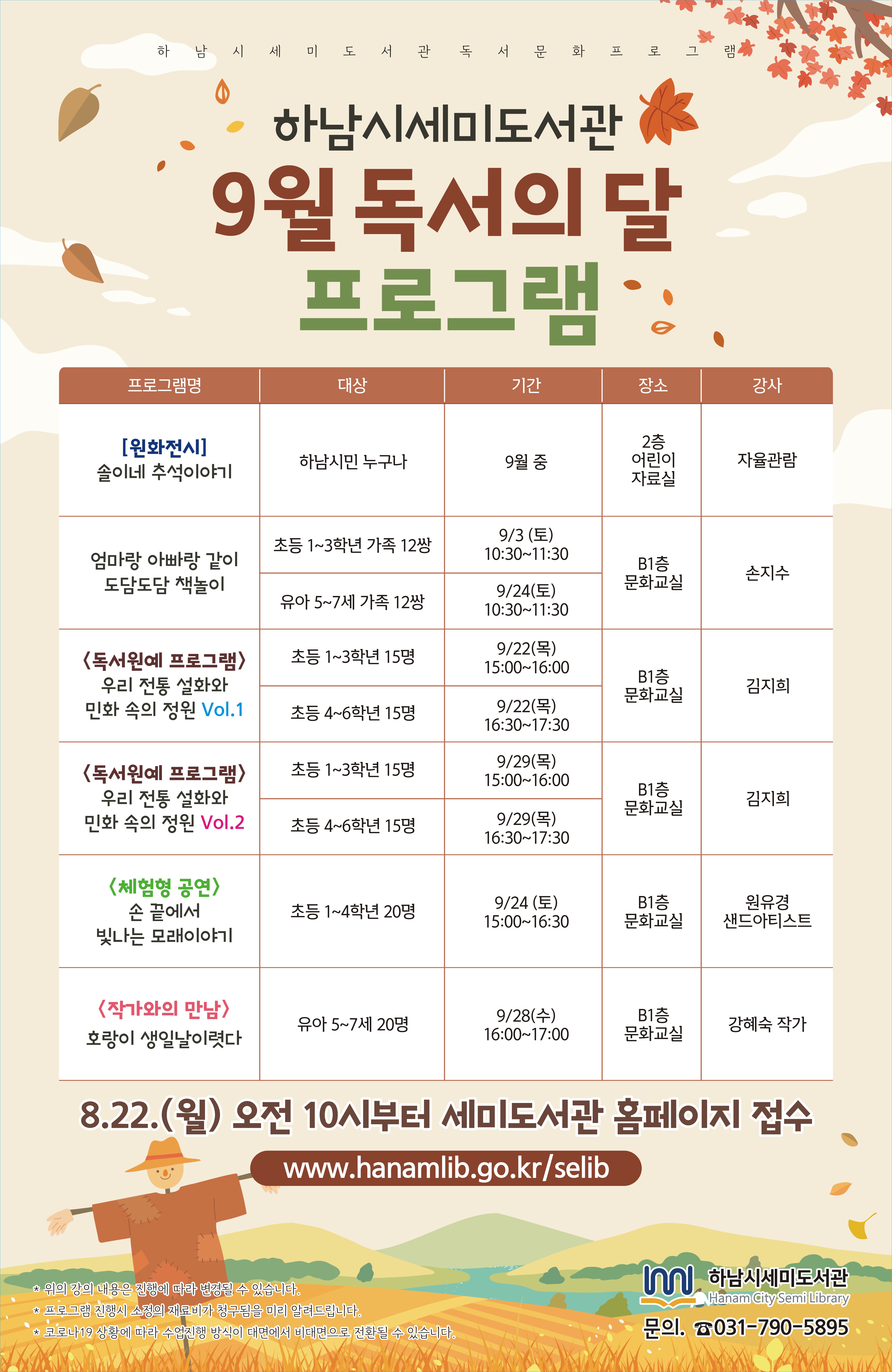 | 내용 | 세미도서관 <우리 전통 설화와 민화 속의 정원> * 재료비 2만원이 청구됨을 미리 알려드립니다. ( 강사에게 직접 입금, 환불 불가, 수업 미참여시 키트 제공) *일 시 : 2022. 9. 22. / (목) 15:00~16:00 *모집기간 : 2022년 8월 22일 (월) 10시부터 세미도서관 홈페이지 > 문화강좌 접수 *모집대상 : 초등 1~3학년 / 15명 *보호자 신청시 비고란에 자녀의 생년월일, 이름 필수 기재 * *진행방법 : 세미도서관 B1층 문화프로그램실 (대면수업)
