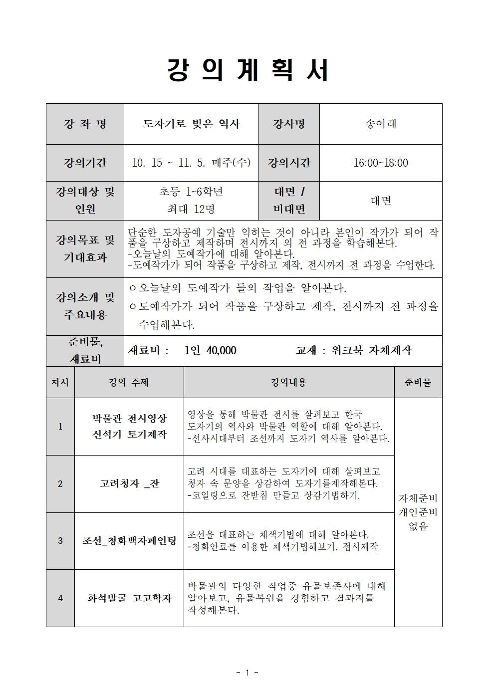 강좌명 | [초등1~6학년] 도자기로 빚은 역사 |