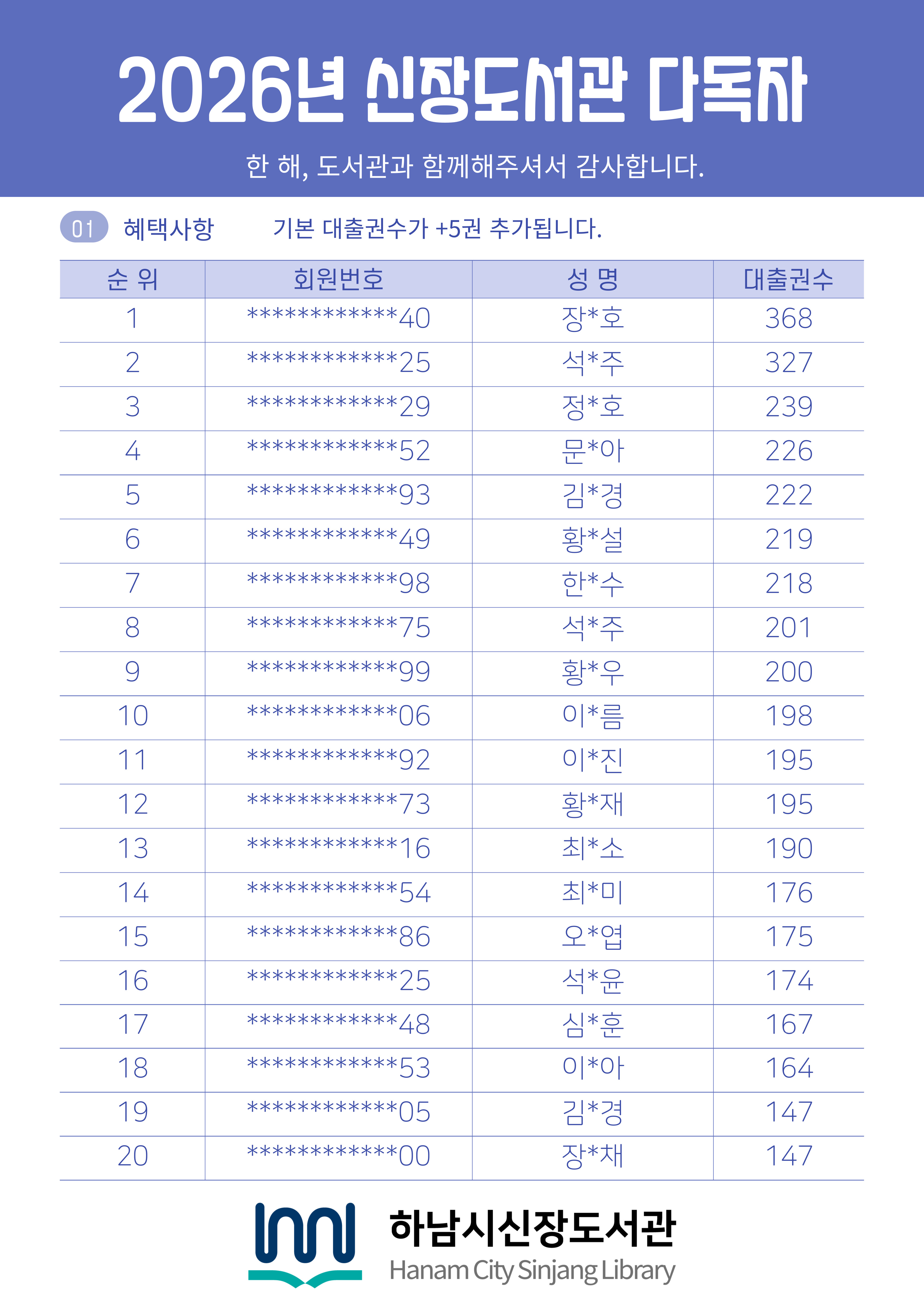 제목 하남시신장도서관 2026년 다독자 선정 안내