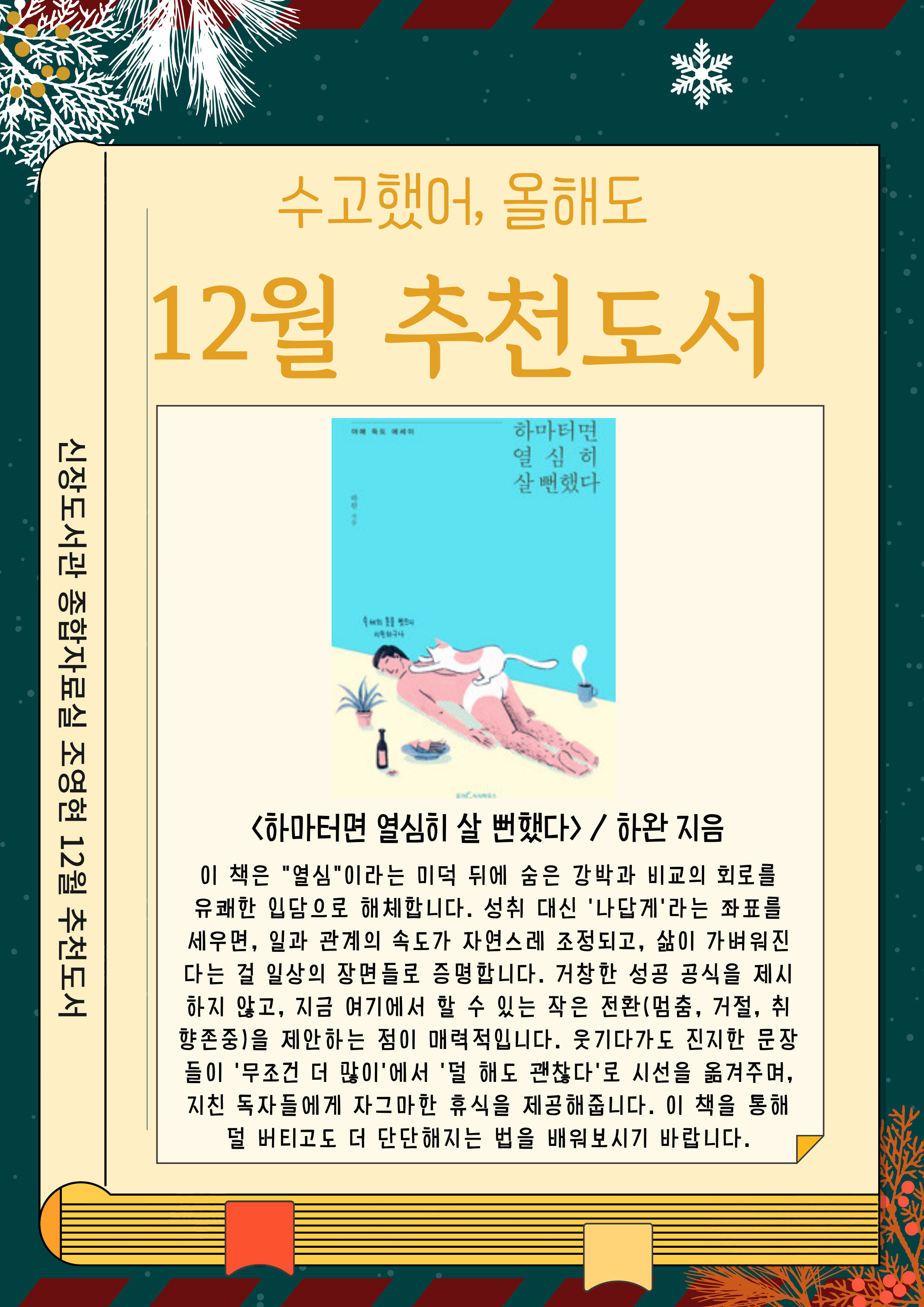 하마터면 열심히 살 뻔했다 : 야매 득도 에세이에 대한 상세 - 제목, 년월, 저자, 출판사, 발행년도, 청구기호, 페이지수, 자료실, 이미지링크, 썸네일, 내용순으로 내용을 제공하고 있습니다.