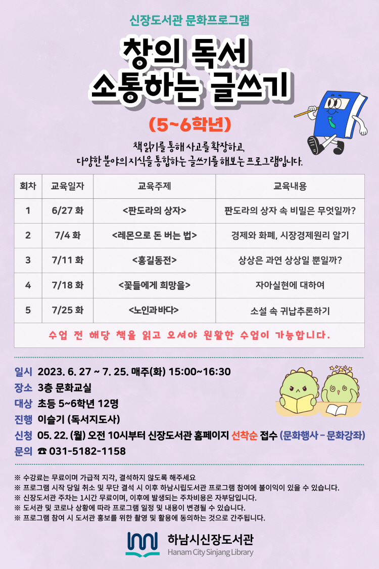 | 강좌명 | <독서> 창의 독서 소통하는 글쓰기 (5~6학년) |