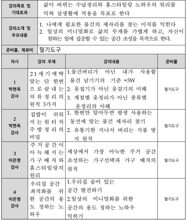 | 강좌명 | [성인] 삶이 바뀌는 집정리 : 홈스타일링 해보기 |