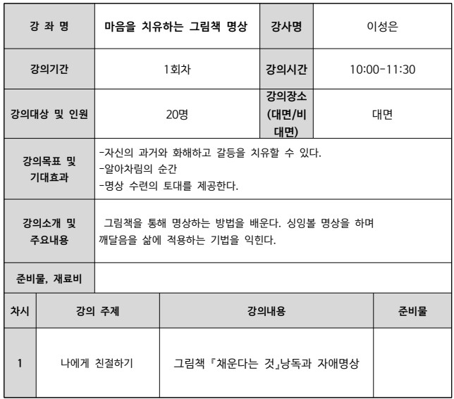 | 강좌명 | [성인] 마음을 치유하는 그림책 명상 |