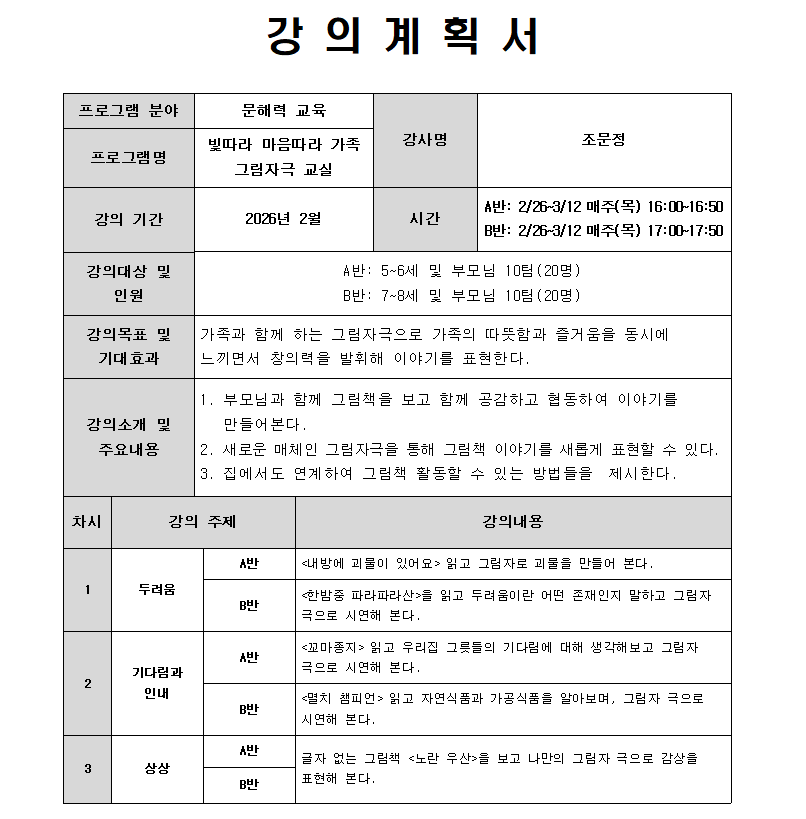 | 강좌명 | (5~6세 및 부모님) 빛따라 마음따라 가족 그림자극 교실-A반 |