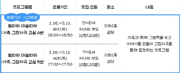 | 내용 | ★수강신청 시, 신청자와 수강자가 다를 경우 비고란에 인적사항을 적어주세요. - 이름, 나이, 성별 (ex. 최하남, 만00세, 남성) ※ 1계정 당, 1명만 신청 가능합니다. ※ 일정 및 내용은 도서관 사정에 따라 변경될 수 있습니다. ※ 프로그램 참여 시, 도서관 홍보를 위한 사진 촬영 및 활용에 동의하는 것으로 간주합니다. ![]()