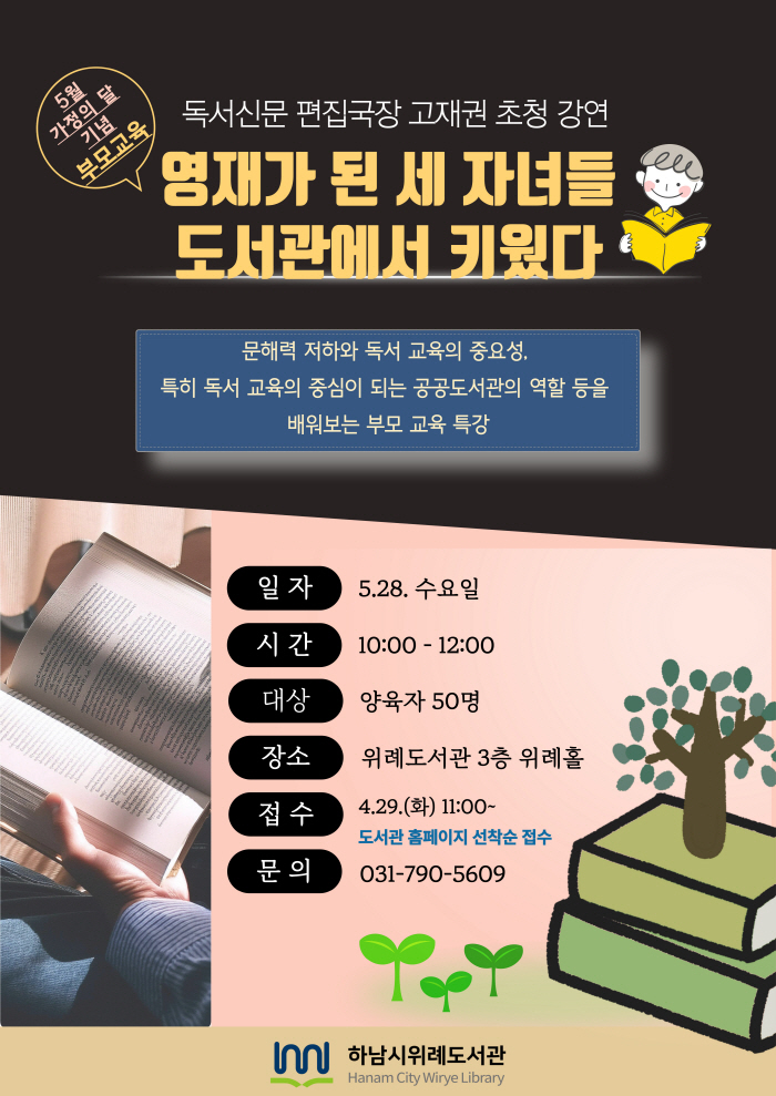 5월 가정의 달 기념 부모 교육을 아래와 같이 안내드립니다. 1) <(미취학)건강한 훈육, 그림책에서 길을 찾다> => 신청하러 가기 2) <(초등)심미적 감수성을 길러주는 그림책 코칭> => 신청하러 가기 3) <영재가 된 세 자녀들, 도서관에서 키웠다> => 신청하러 가기 ![]() ![]() |