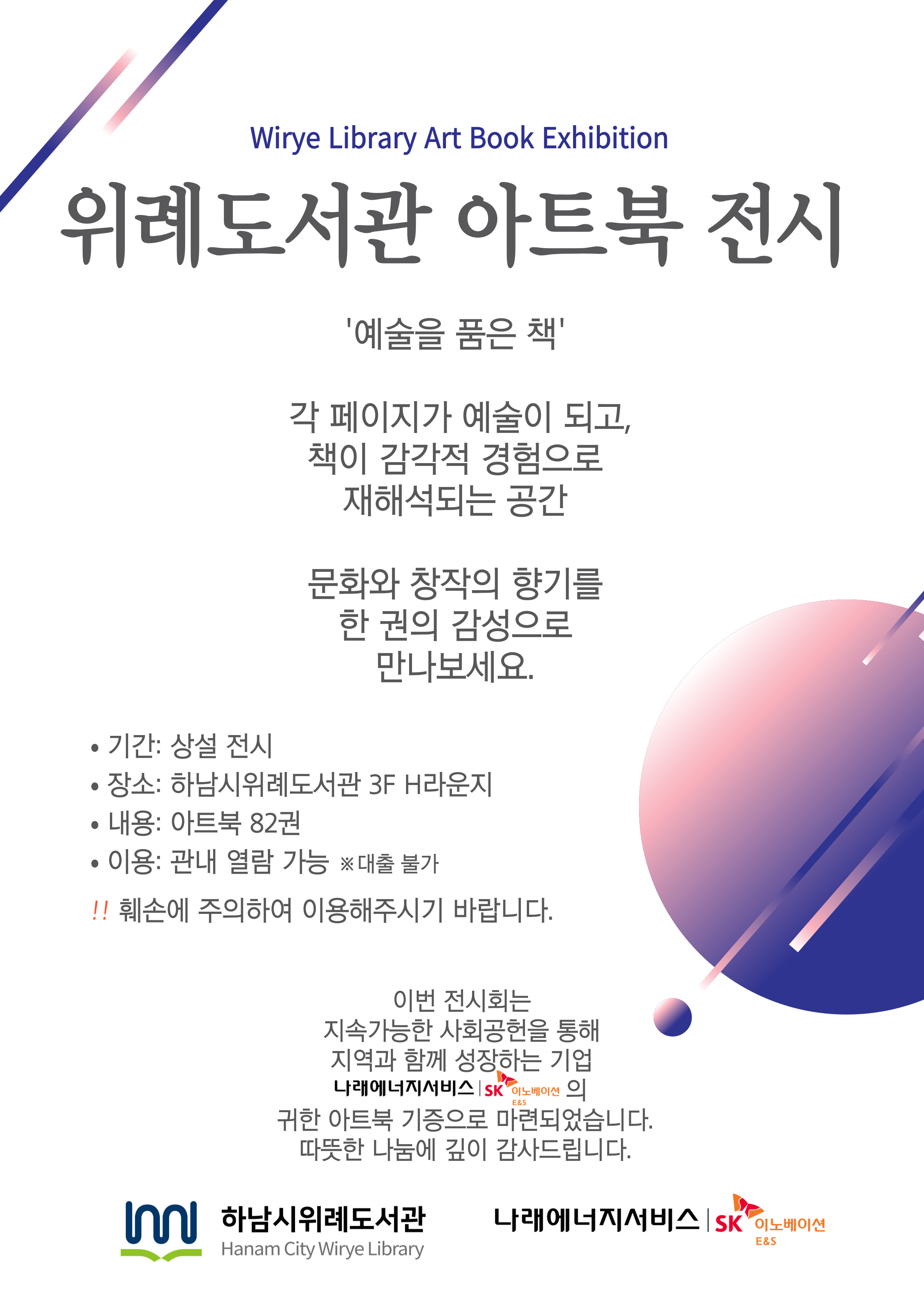 이번 전시는 지속가능한 사회공헌을 통해 지역과 함께 성장하는 기업 나래에너지서비스(주)의 아트북 기증으로 마련된 전시회 입니다. 따뜻한 나눔에 깊이 감사드립니다. 전시장소: 하남시위례도서관 3층 H라운지 전시기간: 2025. 12. 17.(수) ~ 상시 전시도서: 아트북 82권 이용방법: 관내 열람만 가능 ※대출 불가 주의사항: 도서가 훼손되지 않도록 주의하여 주시기 바랍니다. 감사합니다. |