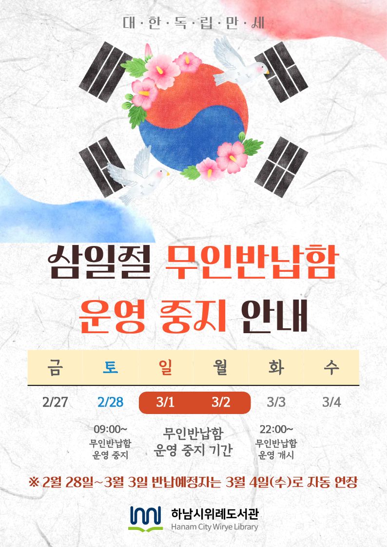 제목 2026년 3월 위례도서관 3·1절 무인반납함 운영 중지 안내