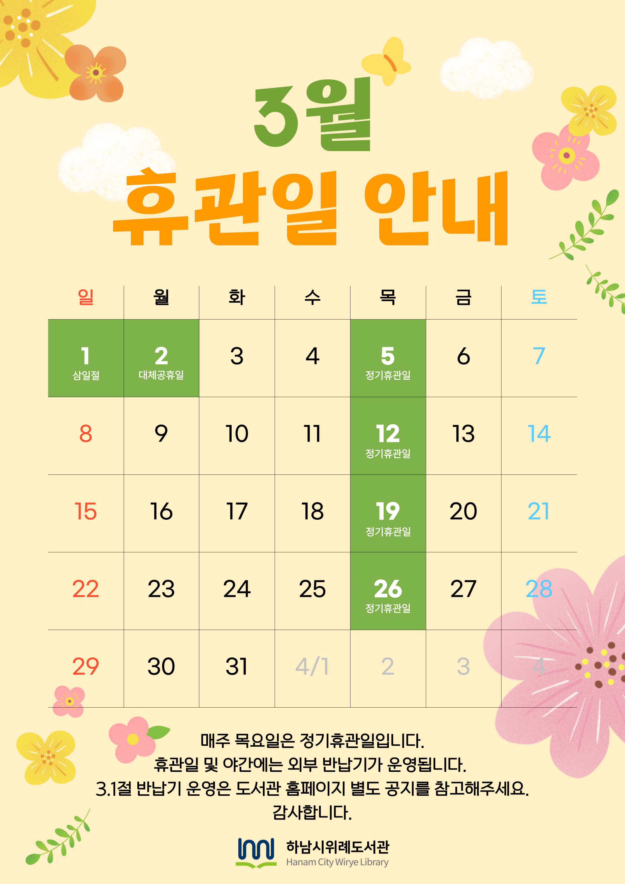 제목 2026년 3월 위례도서관 휴관일 안내