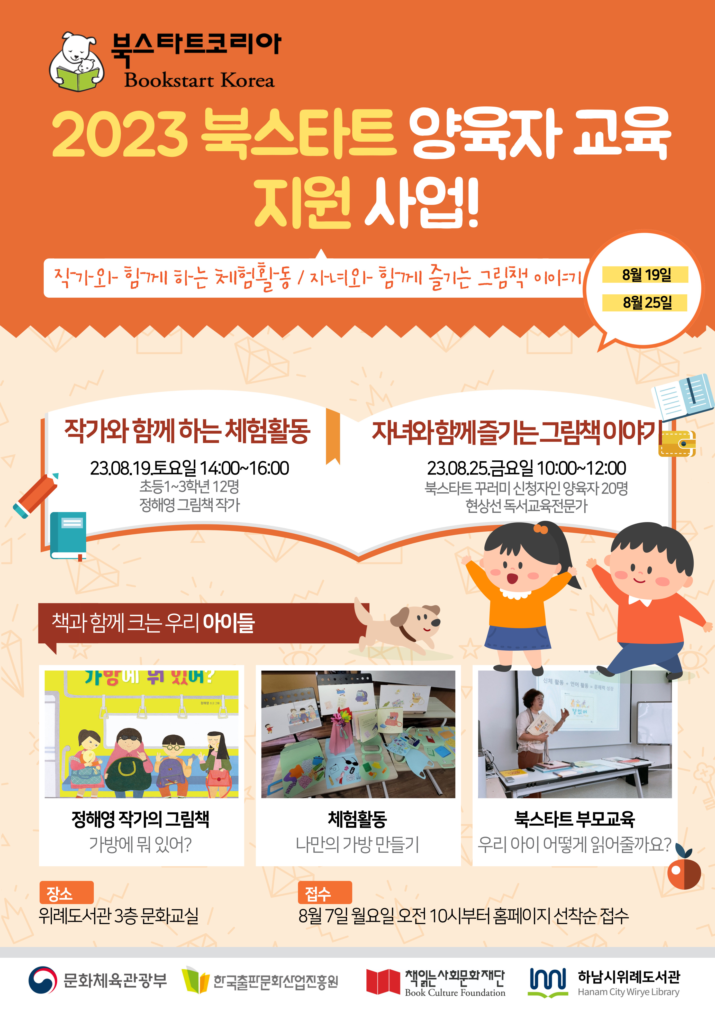 | 내용 | 북스타트코리아 지원하 「2023 북스타트 양육자 교육 지원 사업」의 일환으로 진행되는 프로그램입니다. '가방에 뭐 있어?' 그림책 작가인 정해영 작가의 수업으로 작가가 직접 읽어주는 책 읽기 시간과 가방 만들기 체험활동을 진행합니다. 많은 관심 바랍니다. ---------------------------------------------------------------------------------------------------------------------- ★★유의사항★★ ※올해기준 초등1~3학년 대상으로 진행하는 프로그램입니다. (학년이 다른 경우는 신청 할 수 없으며 안내없이 추후 자동취소됩니다) ※자녀 아이디로 신청하지 않으신 분들은 비고에 자녀이름과 학년을 적어주시기 바랍니다. ※준비물 없는 수업입니다. 기본 준비물은 도서관에서 준비했습니다. ※도서관 수업은 교양 수업으로 학생의 학년별 혹은 교과별 연계에 맞지 않을 수 있으며 아이들 개별 수준에 맞추어 진행되기 어렵습니다. ※현장강의로 진행됩니다.(위례도서관 3층 문화교실) 가급적 지각, 결석을 하지 않도록 해주시기 바랍니다. ※위례도서관 주차는 1시간 무료이며, 이후에 발생되는 주차비는 자부담입니다. ※강의계획서는 파일로 첨부되어있습니다. ※프로그램 당일 취소 및 당일 불참시 2023년 위례도서관 프로그램 신청에 불이익이 있음을 알려드립니다. ※사정에 의해 프로그램 일정 및 내용이 변경될 수 있습니다. ----------------------------------------------------------------------------------------------------------------------