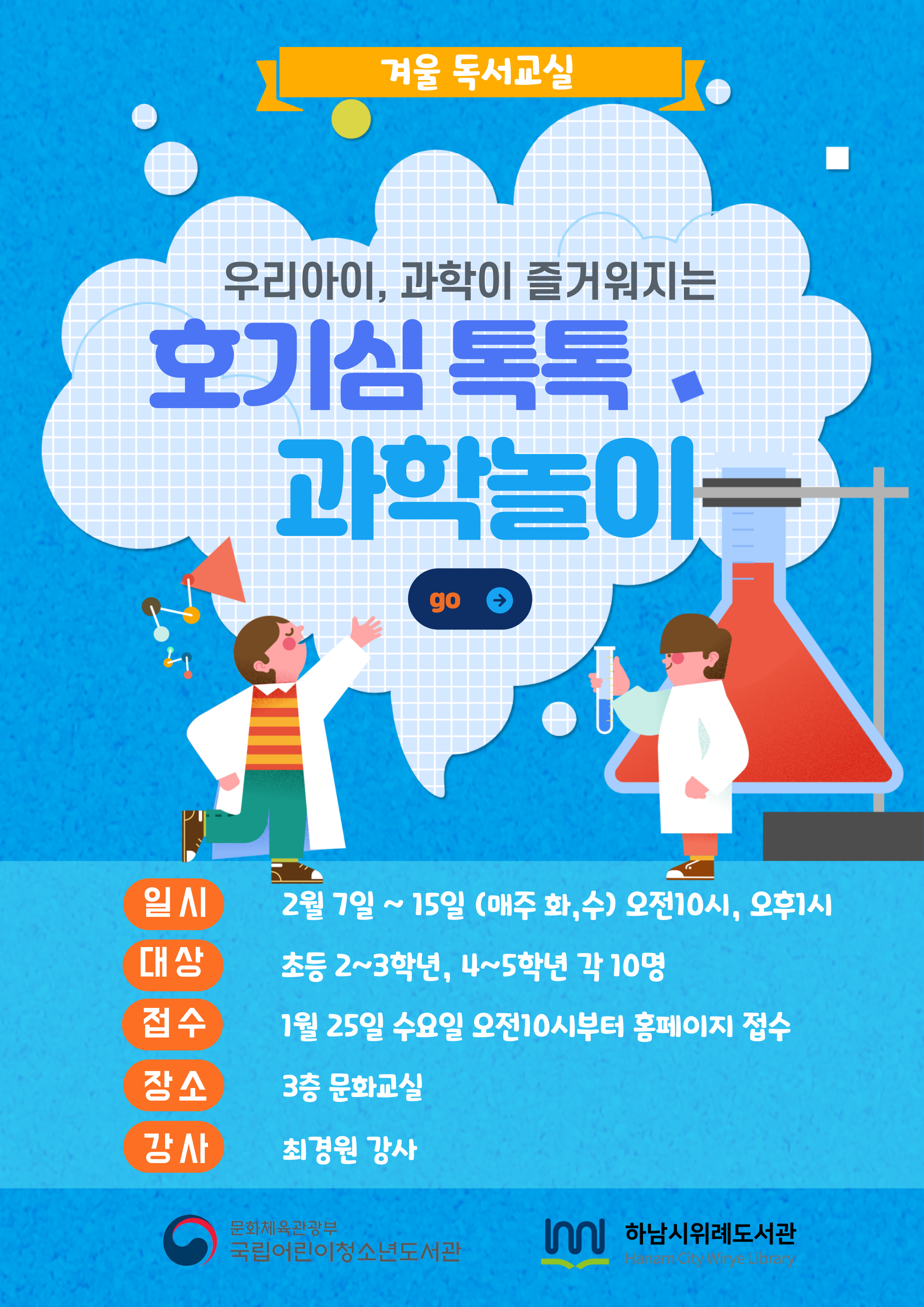 | 내용 | 문화체육부 산하 국립어린이청소년도서관 운영지원하 「20223년 전국 도서관 겨울 독서교실」의 일환으로 진행되는 프로그램입니다. 각 프로그램별 1명의 어린이는 국립어린이청소년도서관장상을 받고 3회 이상 출석시 수료증과 독서노트를 수여받게 됩니다. 유의사항 ※겨울방학을 맞아 예비초등 5~6학년을 대상으로 진행하는 프로그램입니다. (화요일 수요일 2주진행 총 4차시 수업입니다. 학년이 다른 경우는 신청 할 수 없으며 신청이 추후 취소됨을 알려드립니다.) ※자녀 아이디로 신청하지 않으신 분들은 비고에 자녀이름과 학년(나이)를 적어주시기 바랍니다. ※재료비가 있는 수업입니다. 재료비 총 1만원 (신청자분들께 추후 안내문자가 갈 예정입니다.) ※현장강의로 진행됩니다.(위례도서관 3층 문화교실) 가급적 지각, 결석을 하지 않도록 해주시기 바랍니다. ※위례도서관 주차는 1시간 무료이며, 이후에 발생되는 주차비는 자부담입니다. ※강의계획서는 파일로 첨부되어있습니다. ※프로그램 당일 취소 및 2회이상 불참시 2023년 위례도서관 프로그램 신청에 불이익이 있음을 알려드립니다. ※사정에 의해 프로그램 일정 및 내용이 변경될 수 있습니다.