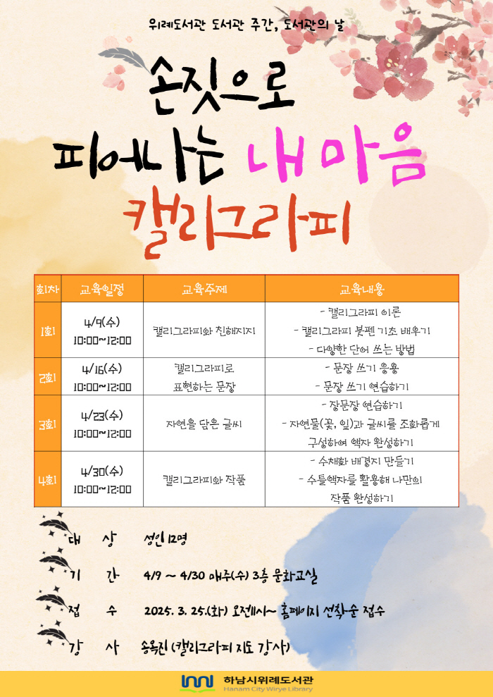| 강좌명 | <성인> 손짓으로 피어나는 내 마음, 캘리그라피 |