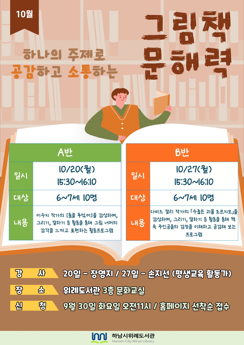 내용 | ★★기타 유의사항★★ ※비고란에 자녀명 기입바랍니다. ※지각, 결석하지 않도록 해주시기 바랍니다. ※위례도서관 주차는 1시간 무료이며, 이후에 발생되는 주차비는 자부담입니다. ※프로그램 당일 취소 및 불참시 2025년 위례도서관 프로그램 신청이 불가합니다. ※사정에 의해 프로그램 일정 및 내용이 변경될 수 있습니다. ※프로그램 참여시 도서관 홍보를 위한 촬영 및 활용에 동의하는 것으로 간주됩니다. ![]() |