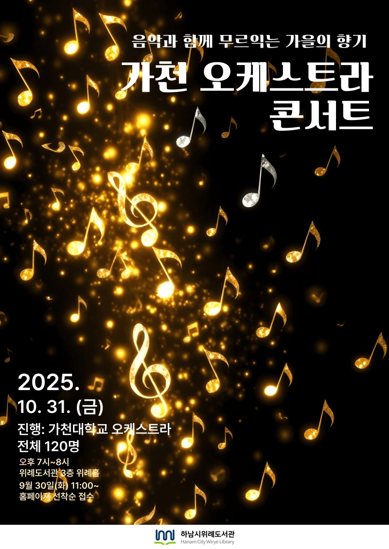내용 | ★★하나의 아이디당 1명만 신청 가능합니다.★★ ★★연주자와 함께 연주를 듣는 참여자분들을 위해 중도 퇴실 및 중도 입장은 자제하여 주시기 바랍니다. 가천대에서 사회공헌의 일환으로 지원하는 오케스트라&성악 공연입니다. 시민분들의 많은 참여 바랍니다. -------------------------------------------------------------------------------------------------------------- ★★유의사항★★ ※원활한 공연 관람을 위해 참여 어린이는 홀 앞쪽에 보호자분들은 뒤쪽에 착석 부탁드립니다. ※가급적 지각, 결석을 하지 않도록 해주시기 바랍니다. ※위례도서관 주차는 1시간 무료이며, 이후에 발생되는 주차비는 자부담입니다. ※프로그램 당일 취소 및 불참시 2025년 위례도서관 프로그램 신청이 불가합니다. ※사정에 의해 프로그램 일정 및 내용이 변경될 수 있습니다. ※프로그램 참여시 도서관 홍보를 위한 촬영 및 활용에 동의하는 것으로 간주됩니다. ![]() |