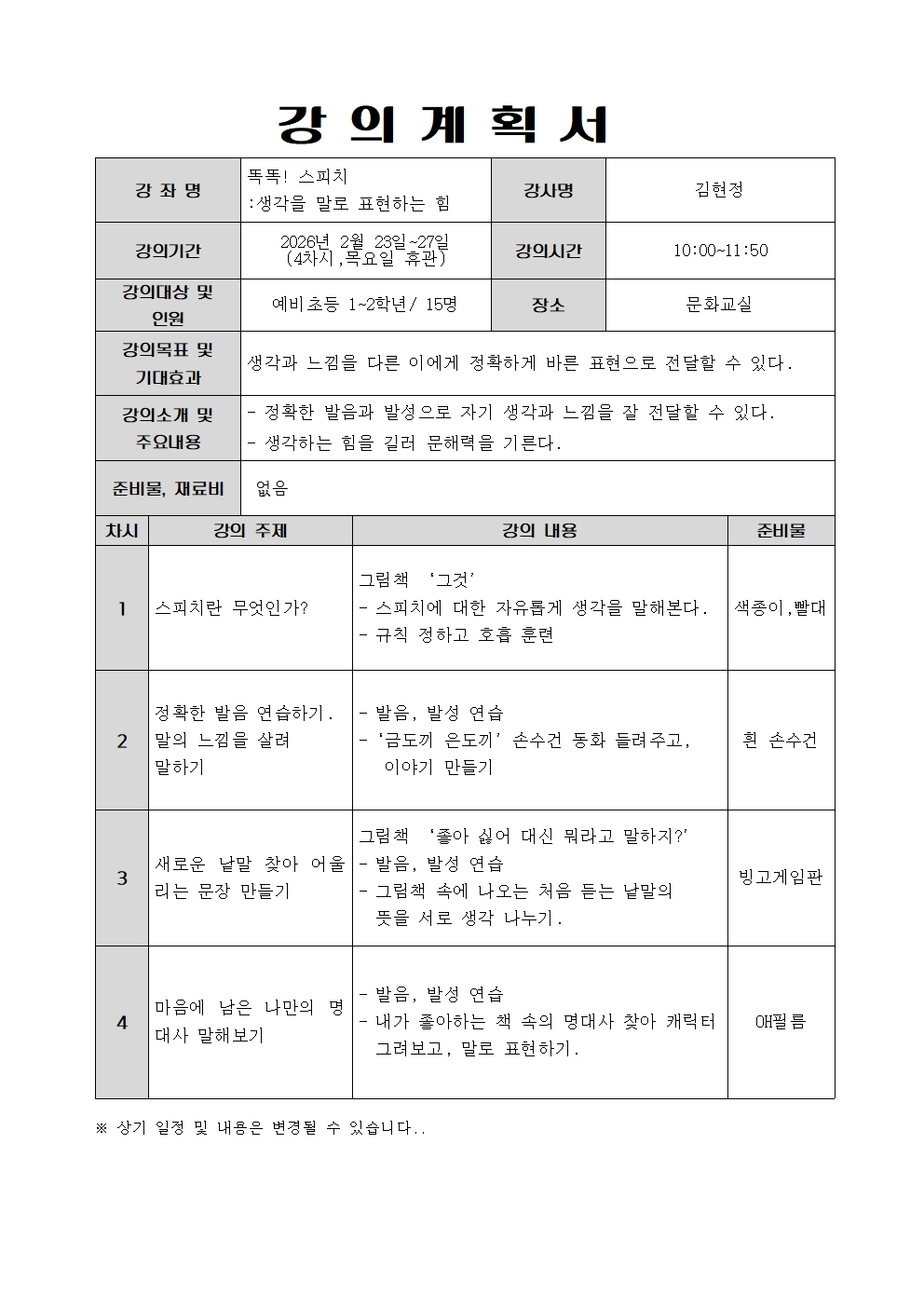강좌명 똑똑! 스피치: 생각을 말로 표현하는 힘